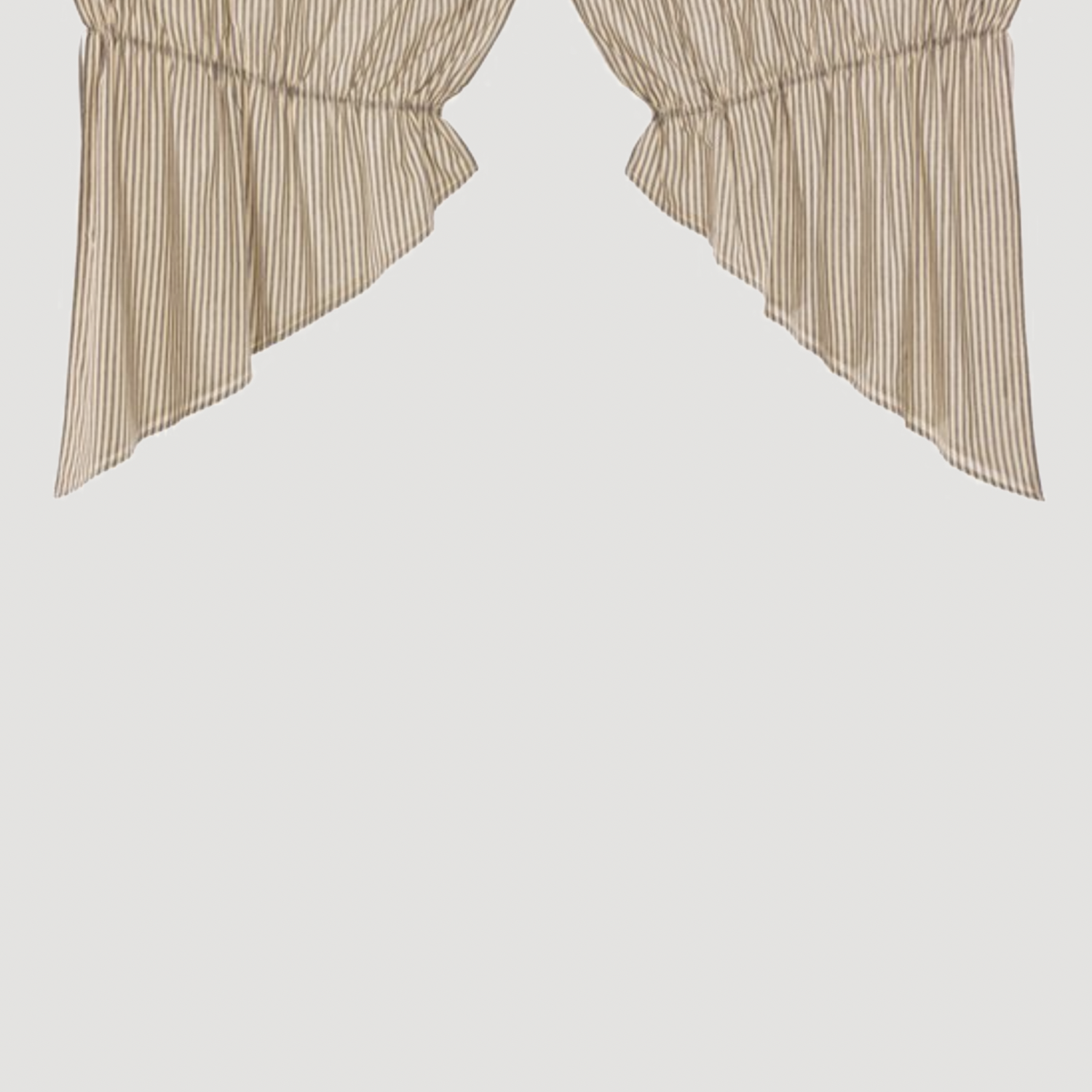 The Sawyer Mill Charcoal Ticking Stripe Prairie Swag Curtains features repeating, black ticking stripes woven into dark creme cotton base fabric. Lined with white cotton to reduce fading & light penetration & finished with a standard .5 inch hem fold.