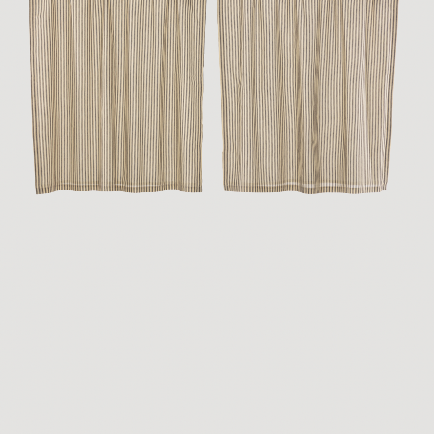 Availability: In Stock$49.95The Sawyer Mill Charcoal Ticking Stripe Short Panel Curtains features repeating, black ticking stripes woven into dark creme cotton base. Lined with white cotton to reduce fading & light penetration, finished with a standard 3 inch hem fold.