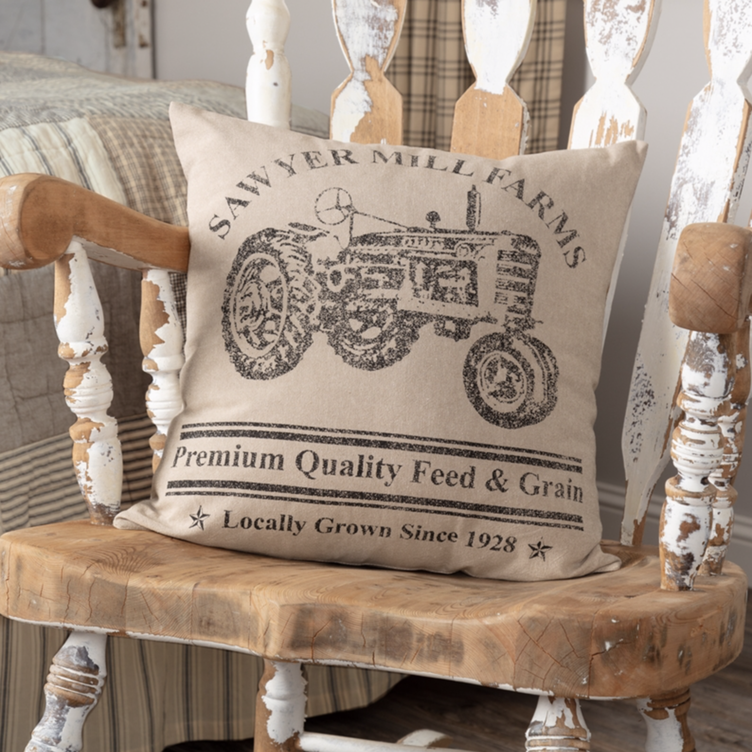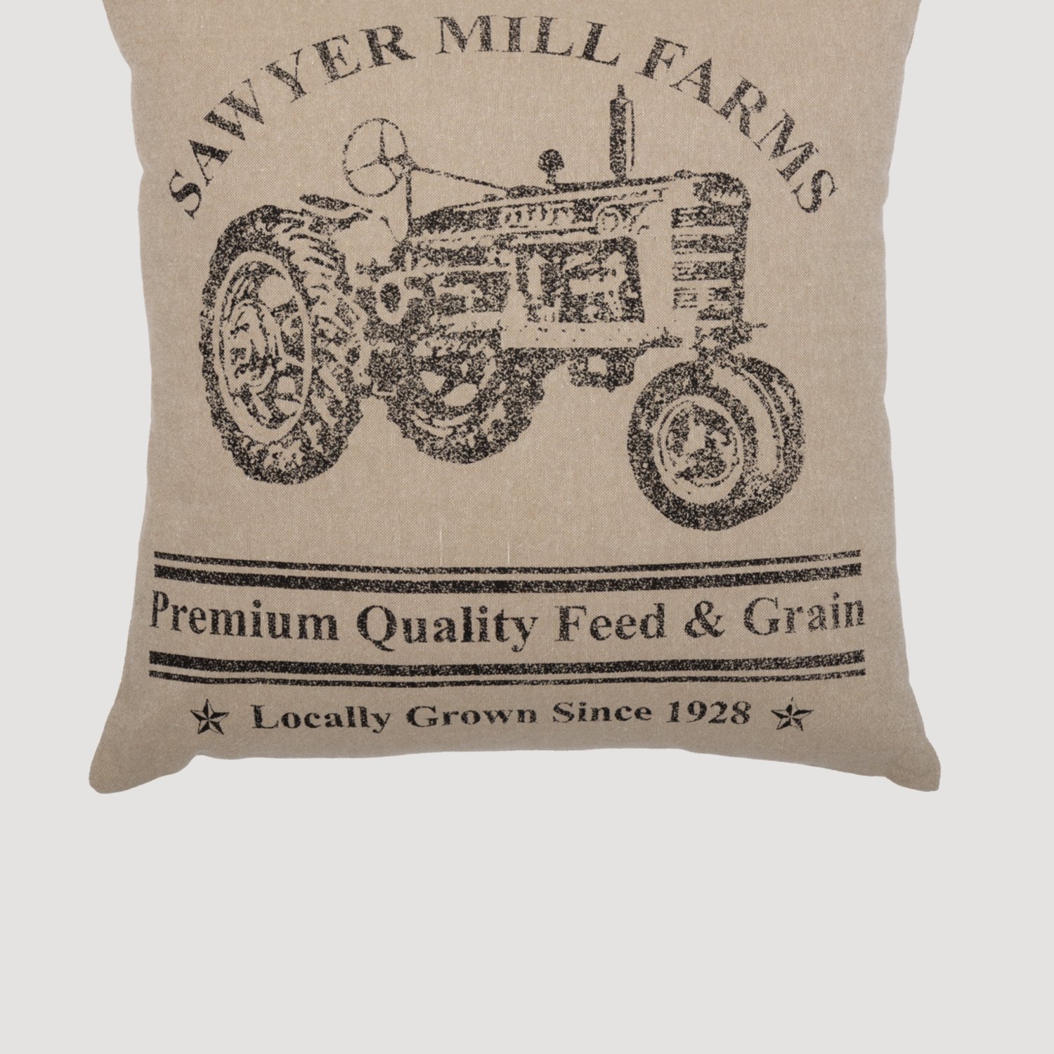 - STENCILED PHRASE: Pillow reads "Sawyer Mill Farms, Premium Quality Feed & Grain, Locally Grown Since 1928"