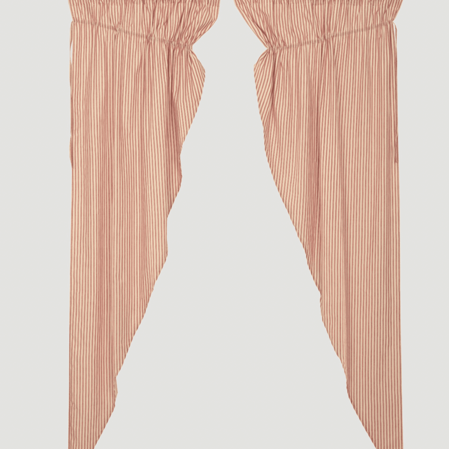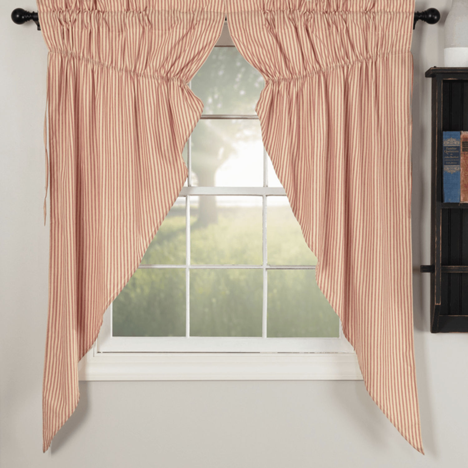 Add the simple, clean, look of the Sawyer Mill Red Ticking Stripe Prairie Panel Set to your country home. The timeless ticking stripe fabric makes a bold window treatment that features textured cotton fabric in country red and dark tan ticking stripes.