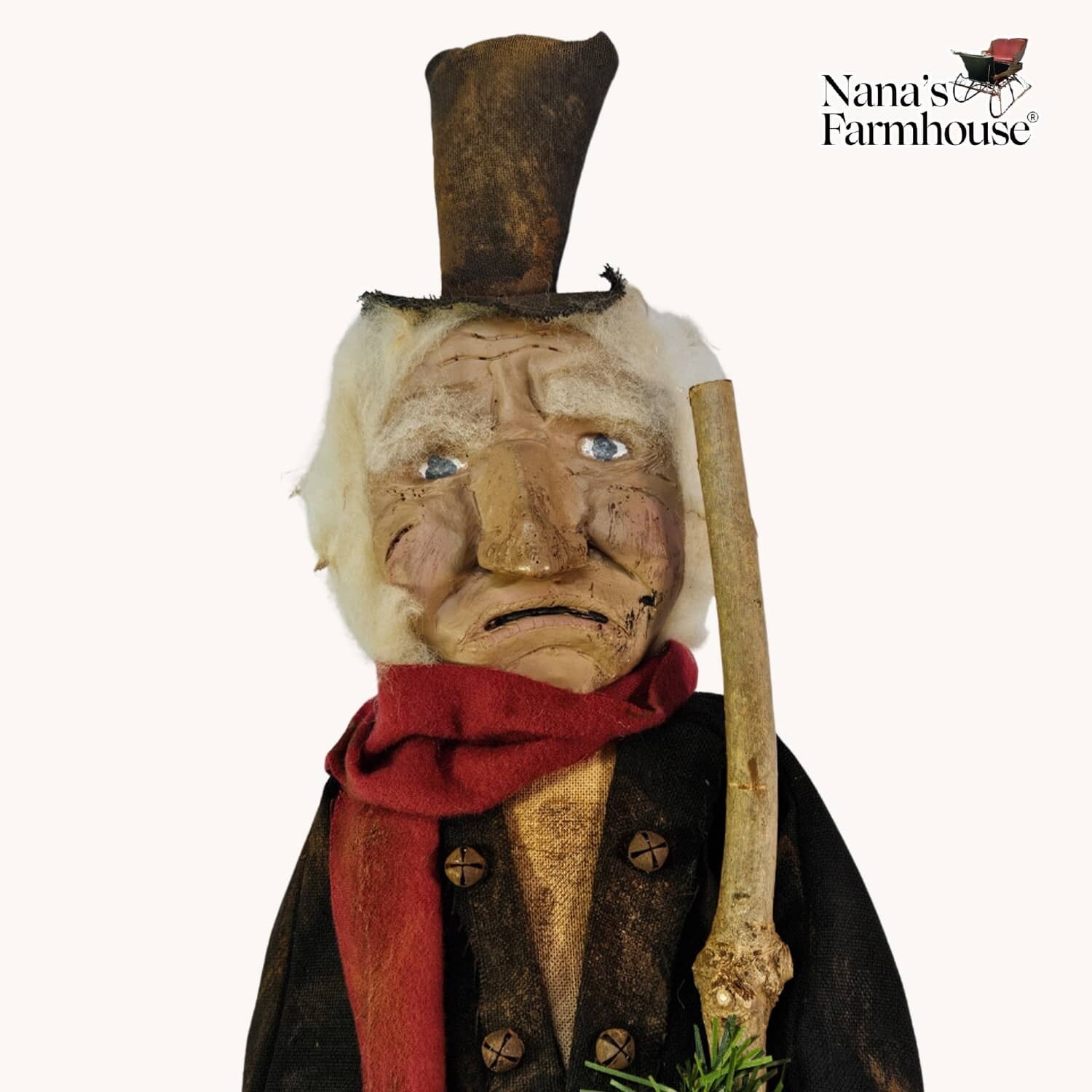 This Primitive Scrooge is a timeless character for your Christmas display. Handmade in the USA with a clay face to make him look realistic. Stands on a wooden base. Colonial detailing with top hat, long robe and holding a lantern with a light.