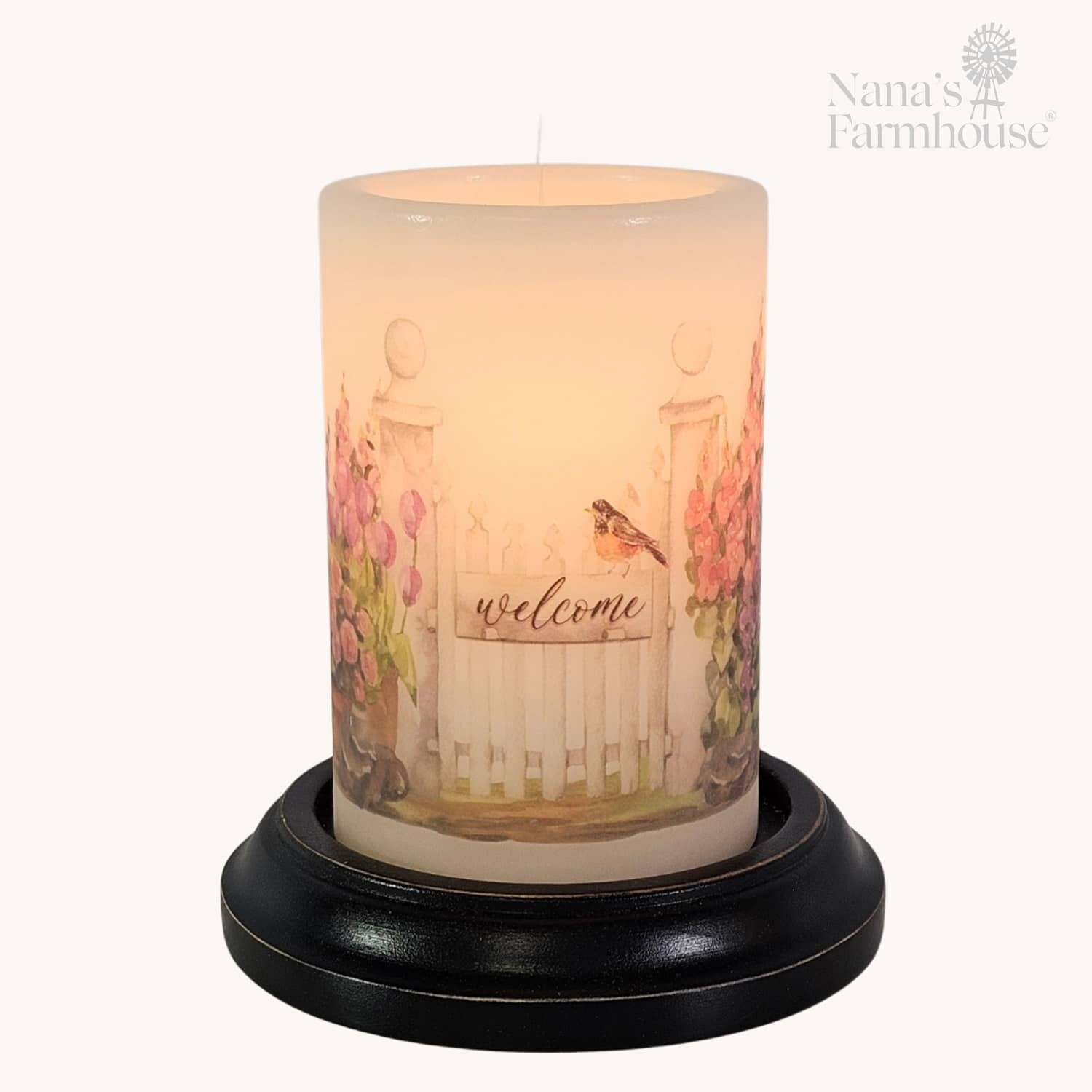 Garden Gates are a romantic touch to an outdoor space and welcome you. With Spring time it is an even more special place as the blooms appear. This Candle Sleeve brings a touch of that color and a warm glow to any space.