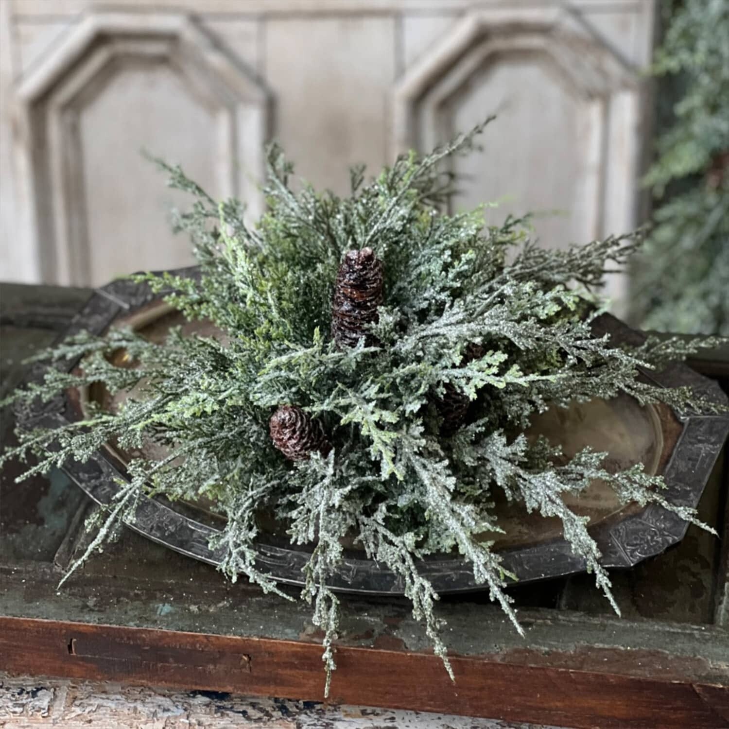 This beautiful cedar half sphere provides a glittery sheen featuring natural pines. Perfect for creating a unique, wintry atmosphere to any decor.