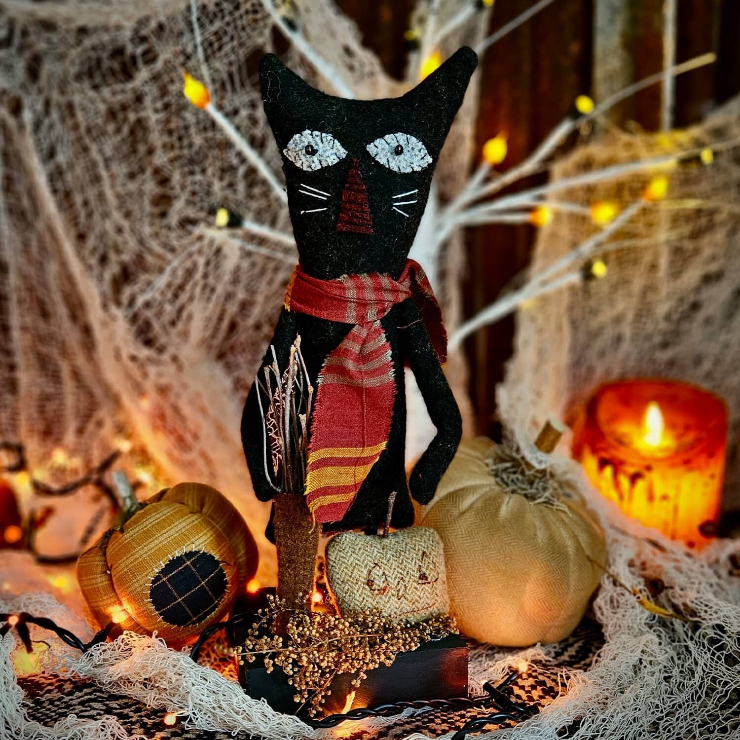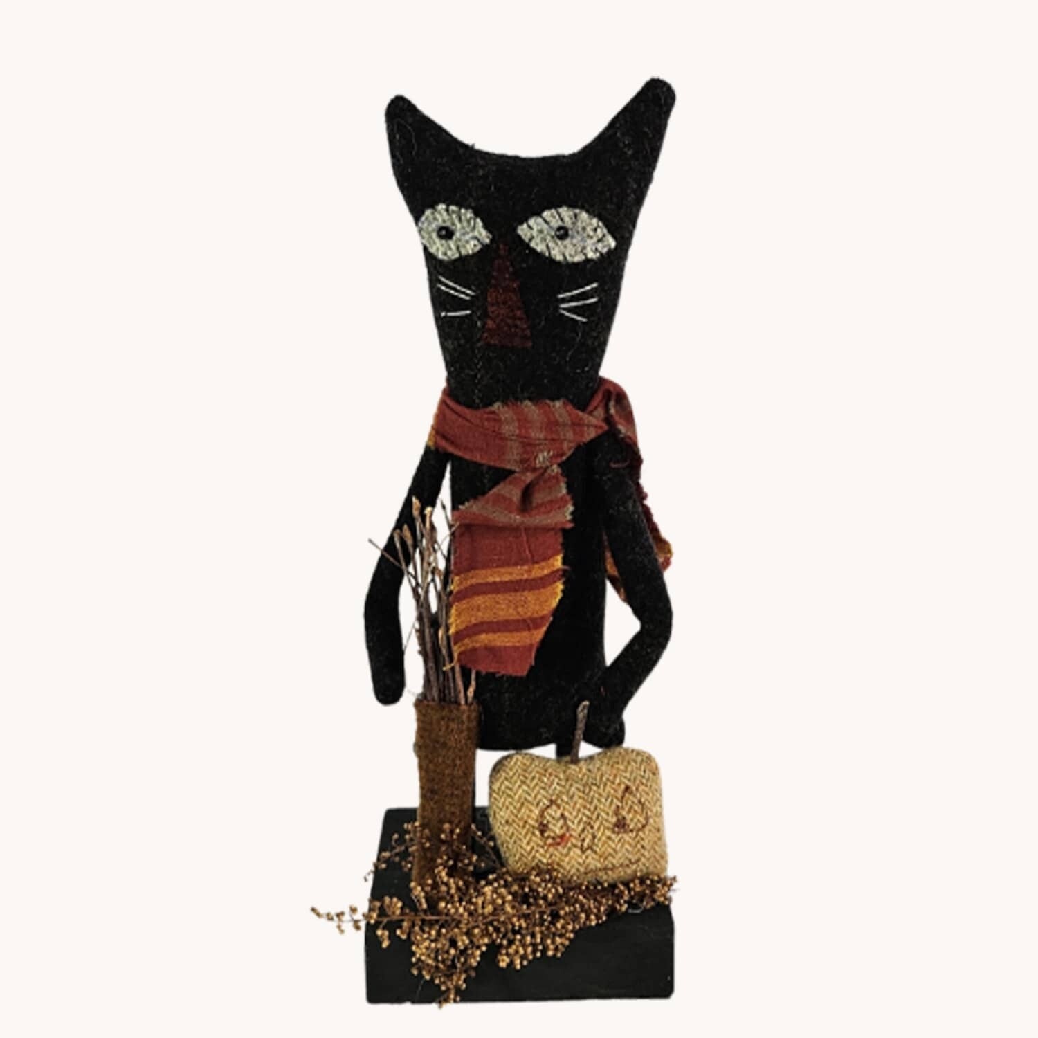 The tiny pumpkin, sitting with this wool felt black cat, has hand embroidered face and a twig stem. Delightful features have been carefully stitched in place to create the "purrfect "expression for the cat. In stock and ready to ship.