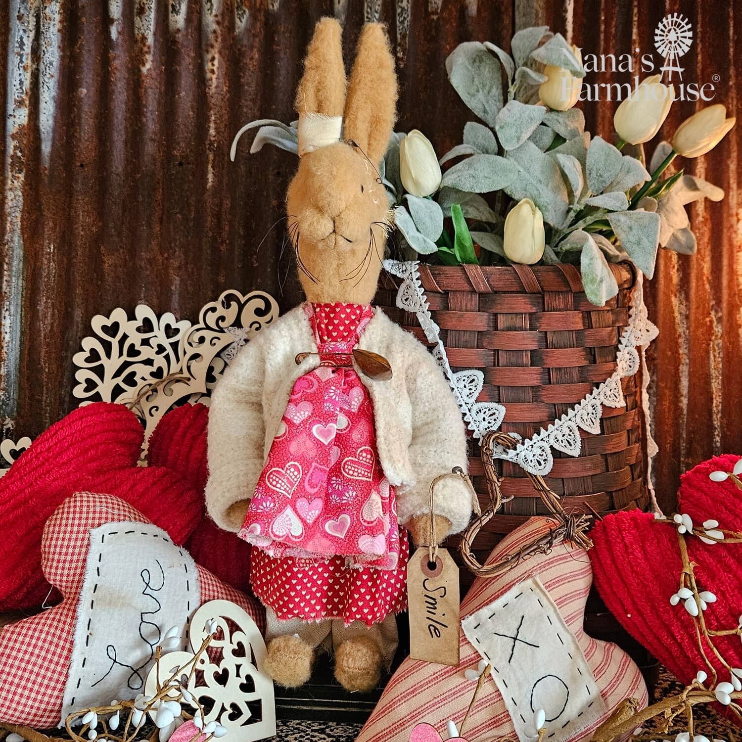 This romantic lady is Smile Girl! In her white sweater, the hearts on her red apron help her stand out for love. Handmade in the USA. Stands on wooden base.