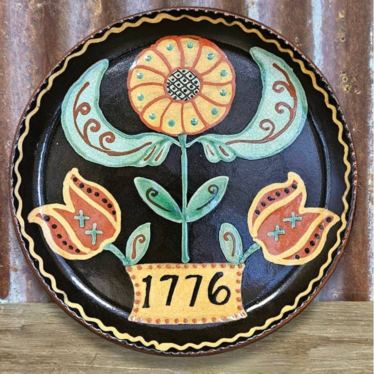 This handmade plate features a beautiful floral design with 1776 black background and scalloped edges. Original design from Smith Redware pottery. In stock and ready to ship.