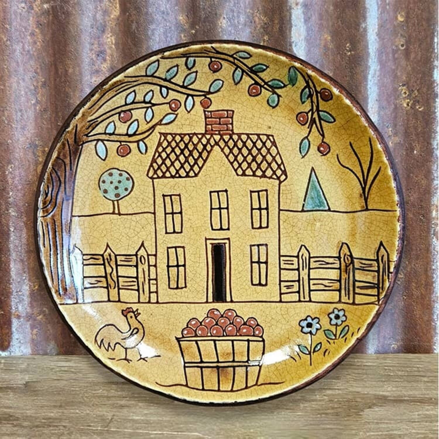This handmade plate features a cozy scene featuring a cottage house and fence accented with trees, flowers and chickens. Original design from Smith Redware pottery. In stock and ready to ship.