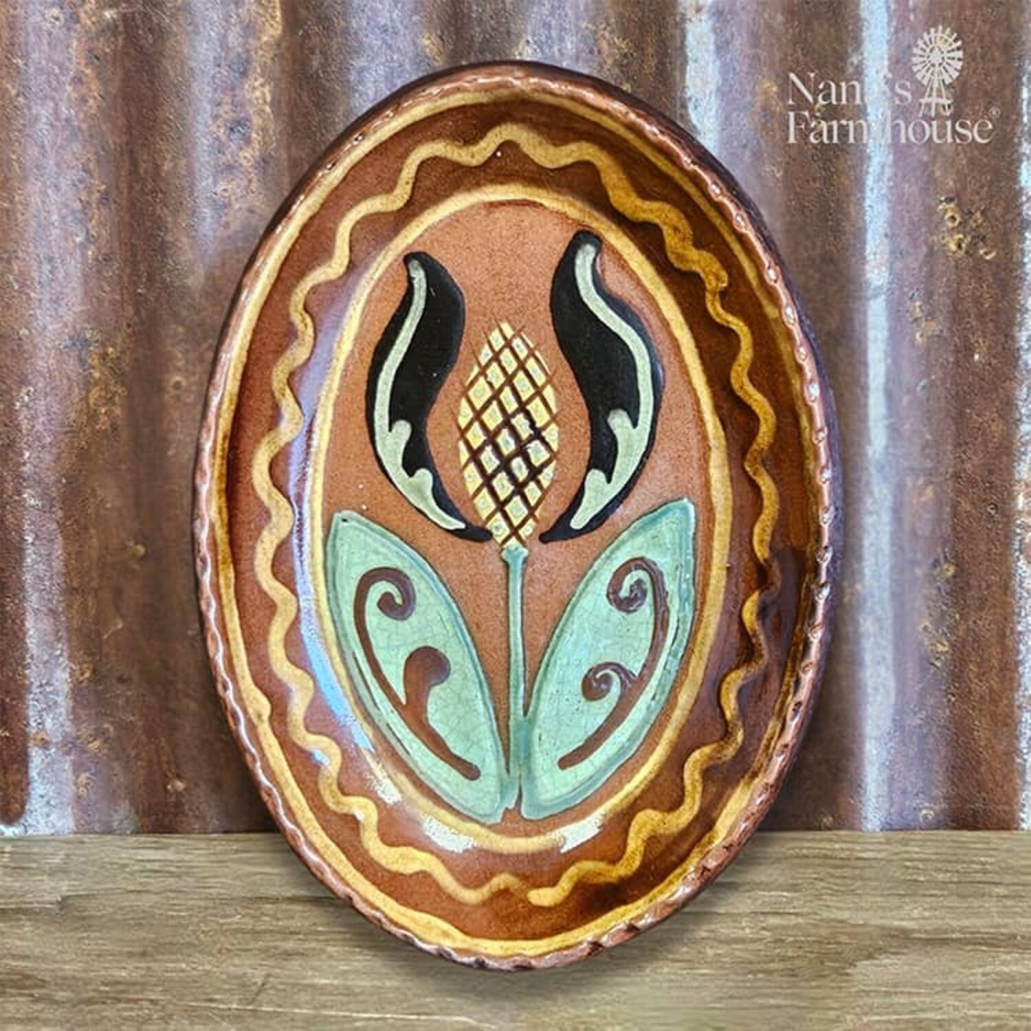 Smith Redware Flower with Green Leaves & Yellow Flower Oval Plate - 6.5"