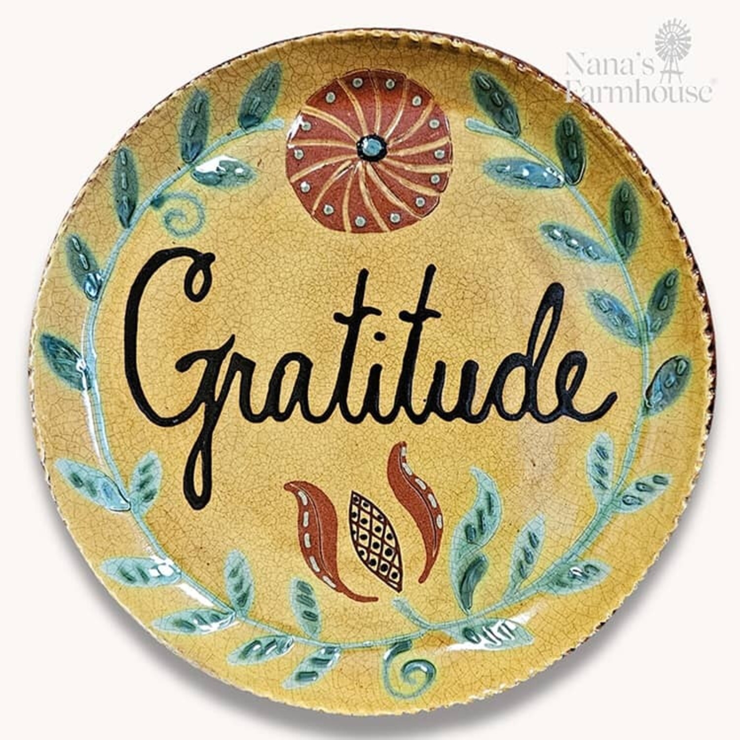 This beautiful piece features the word Gratitude with green vines and subtle scalloped edging. This handmade piece adds warmth to any hutch, shelf or tabletop. Original design from Smith Redware pottery. In stock and ready to ship.