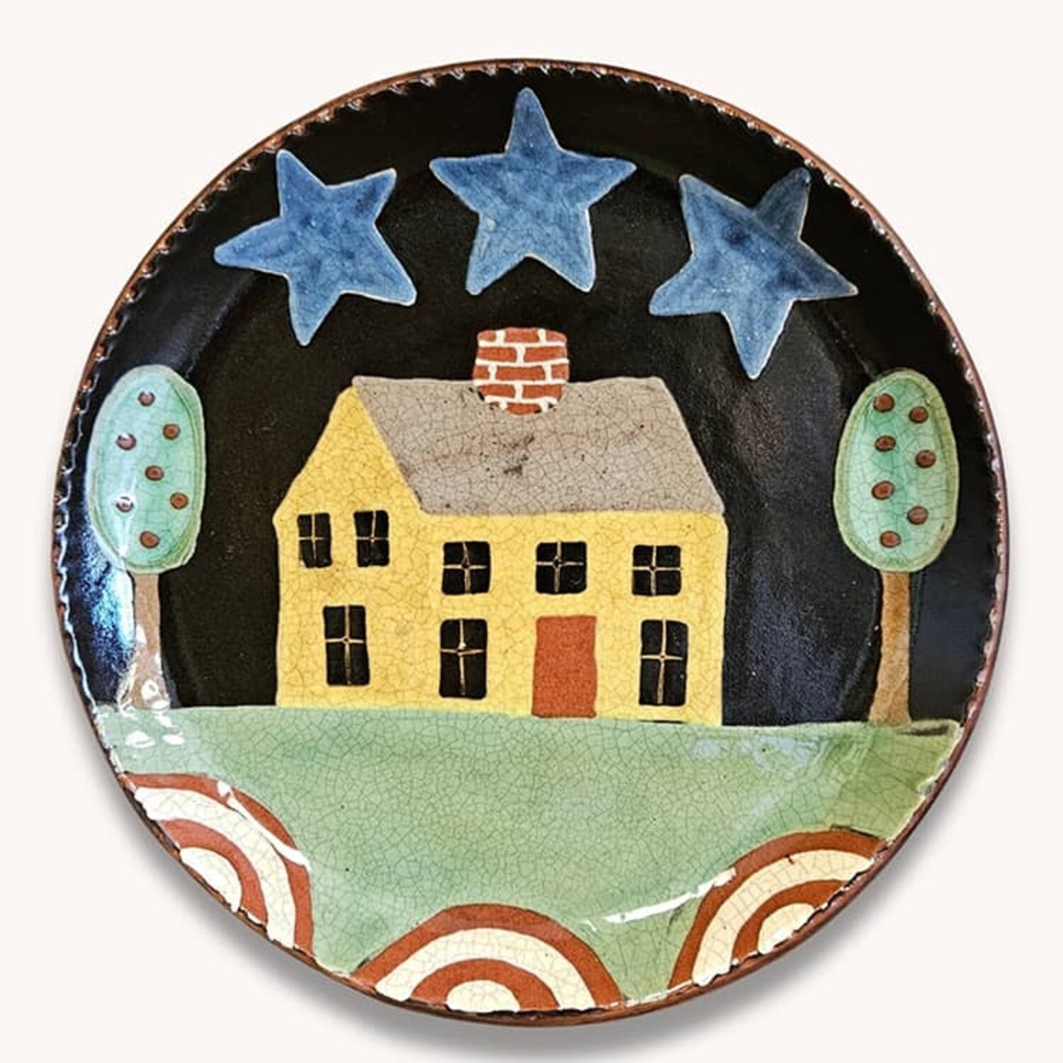 This handmade plate features a cozy house and trees underneath beautiful blue stars. Original design from Smith Redware pottery. In stock and ready to ship.