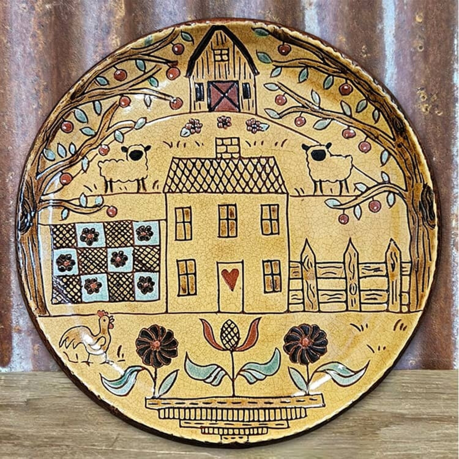 Smith Redware Salt Box House Plate with Two Sheep & Quilt & Flowers - 10.5"