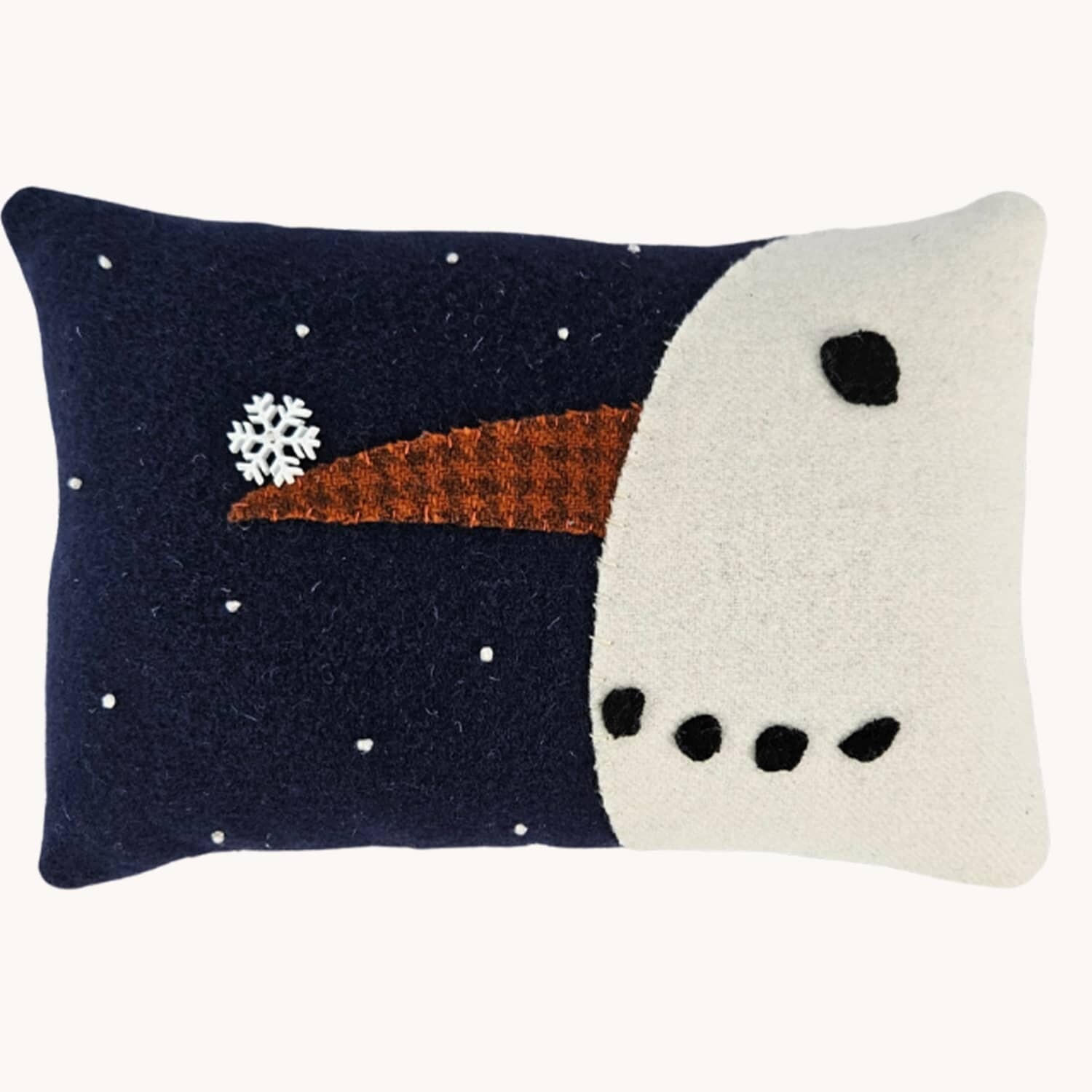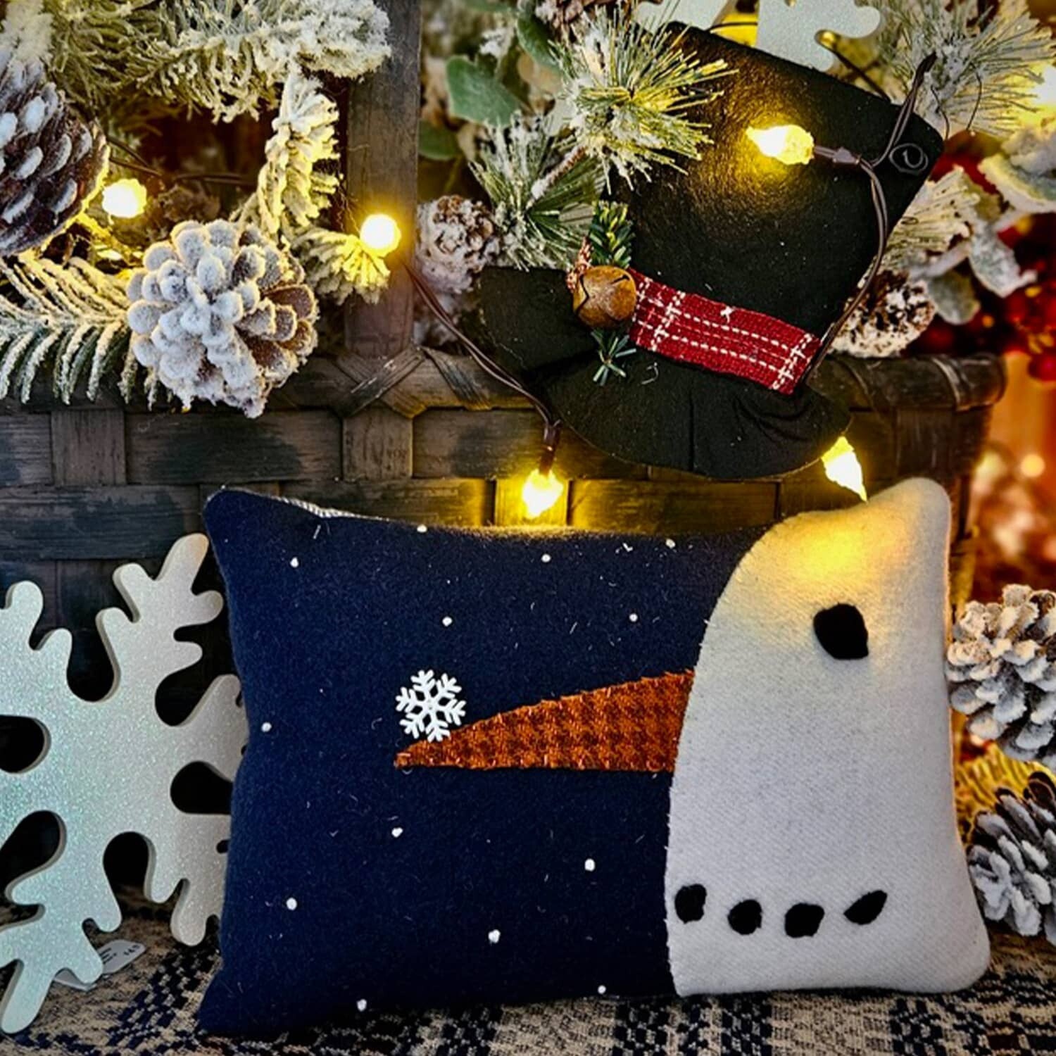 What could be more enchanting than a snowman with a snowflake on his nose? This hand appliqued pillow also has tiny embroidered stars stitched onto the night sky. Charming! In stock and ready to ship.