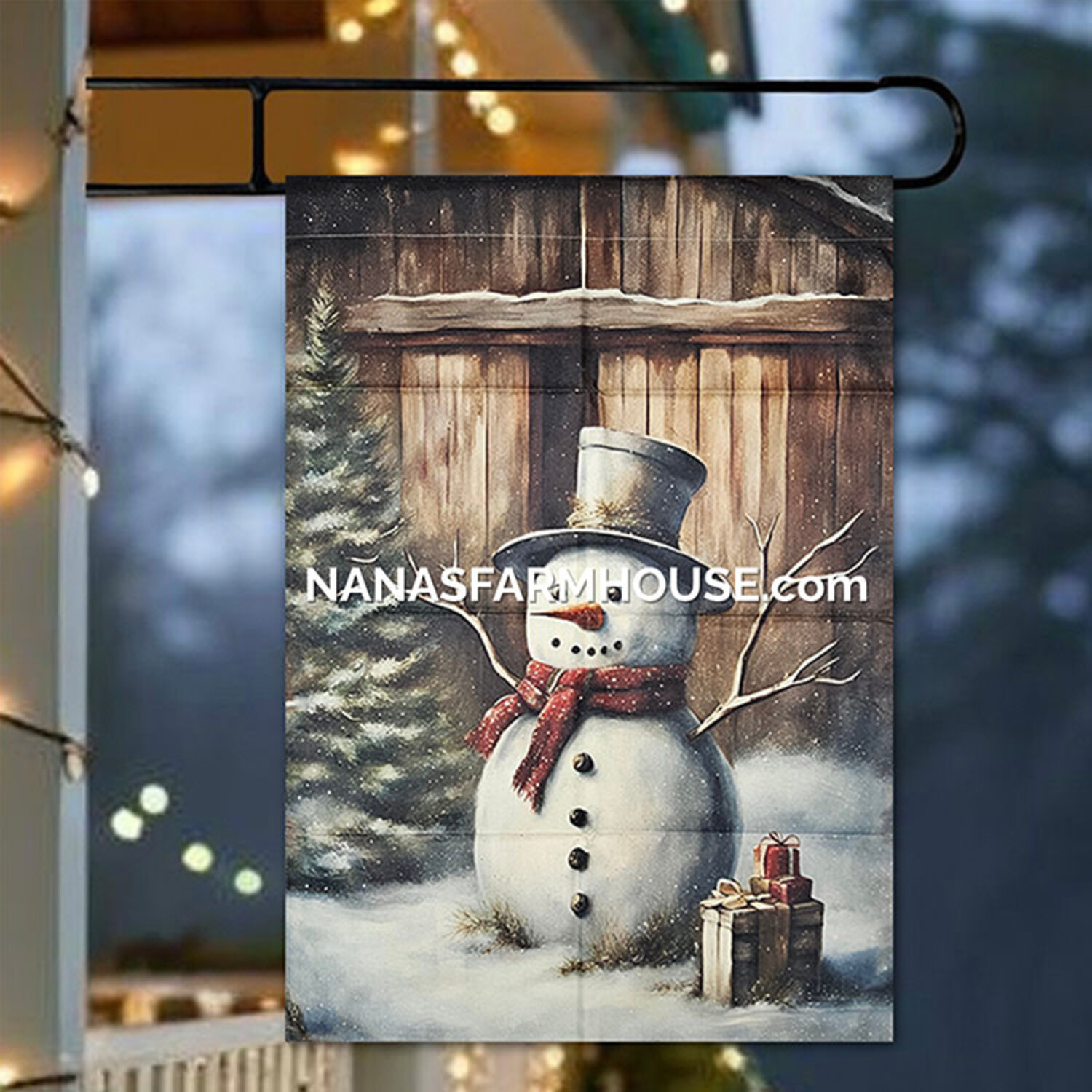 Features of the Snowman with Gifts Garden Flag: