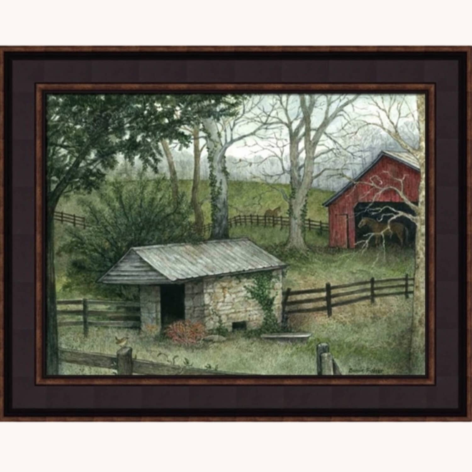 A beautiful print of an old country Spring House. The place where our ancestors kept their butter and milk in the cold water that ran under the building. This scene also features a horse, bird and larger farmhouse barn.