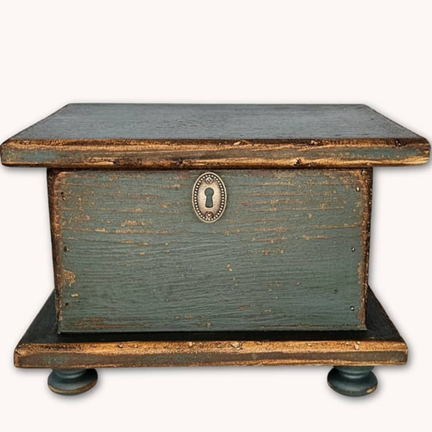 This Primitive Sugar Box is a great display piece but also great for storage. Handpainted in Arnett Blue with a distressed finish. Made of solid wood.
