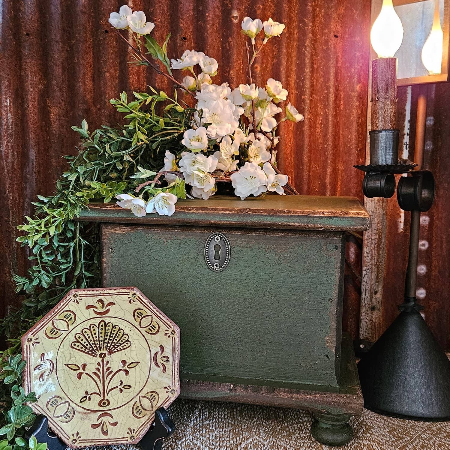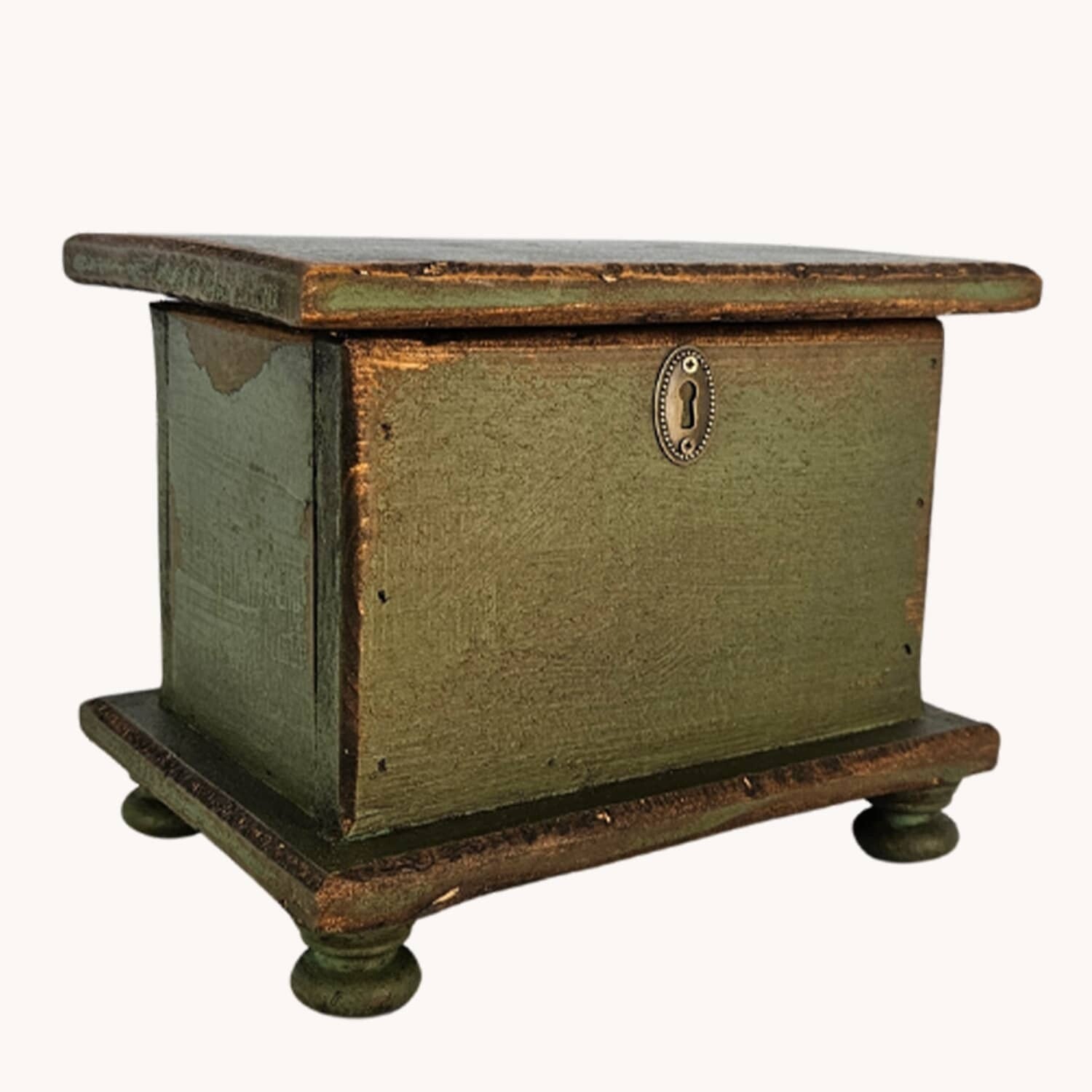 The small Rustic Green Sugar Box has a distressed finish. Handmade in the USA. Useful storage in your Primitive home. Handpainted in green. Made of solid wood.