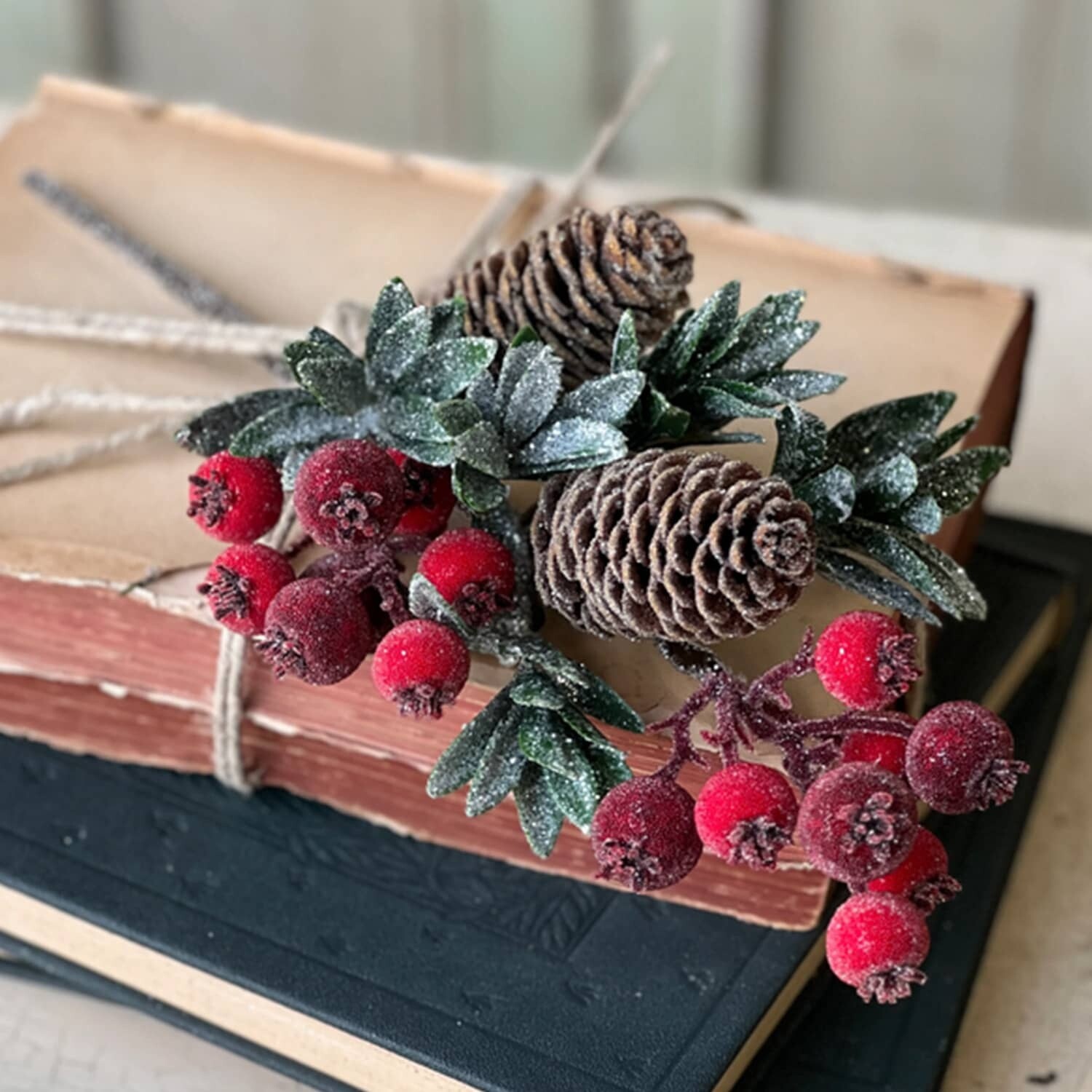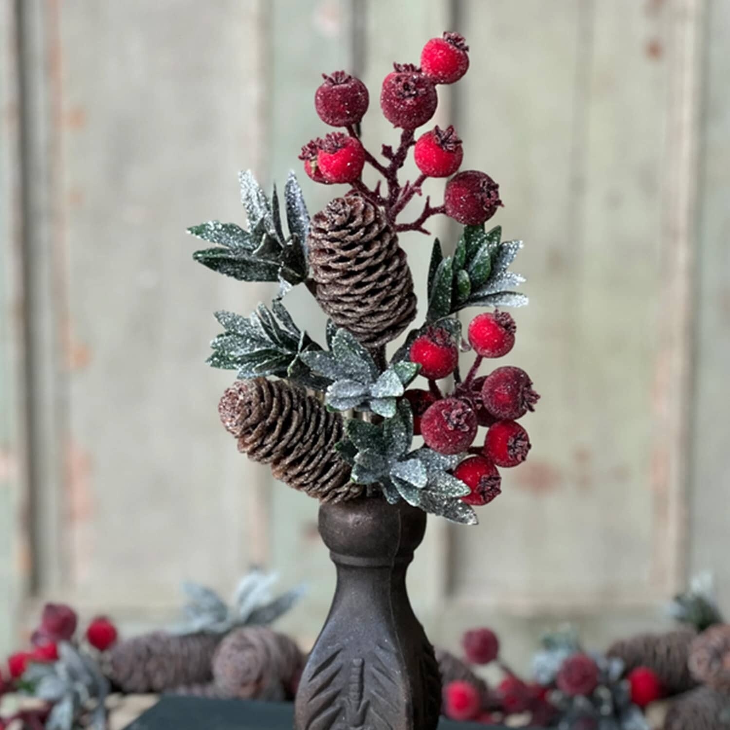 - Materials: Plastic, Styrofoam berries, natural pine cones, glitter, icy coating, paper wrapped wire stem
