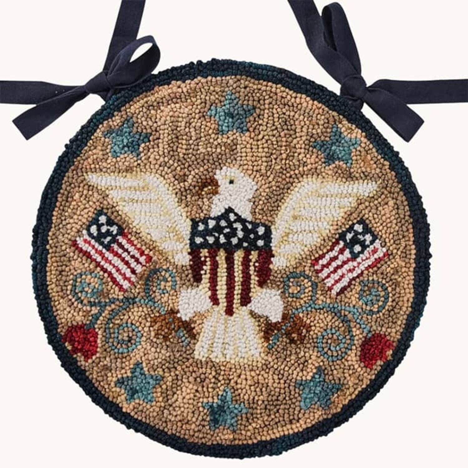 Sweet Land of Liberty hooked chair pad featuring an eagle, flags, stars and flowers. Adds protection for your chairs and brings comfort. Ties connect the pad to your chair for a secure surface. In-stock and ready to ship.
