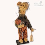 Hand knit blue jumpsuit and carrying a shoulder bag, charming ears, and paws with embroidered detail, this boy bunny rabbit doll is sure to steal your heart. 24" tall he is a dapper gentleman. In stock and ready to ship.