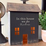 Snowy Christmas scene with red barn and gray shed. Each has a Christmas wreath. Electric light inside with glow through window panes, slit above the barn door, and star cut outs on each side. Folk art that you will enjoy for years to come.