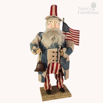 Handmade Primitive Abe Lincoln with great detailing. Doll features the American Flag, Abe's hat, and a shoulder bag. Stands on a small wood base. Handmade in the USA. In-stock and ready to ship.