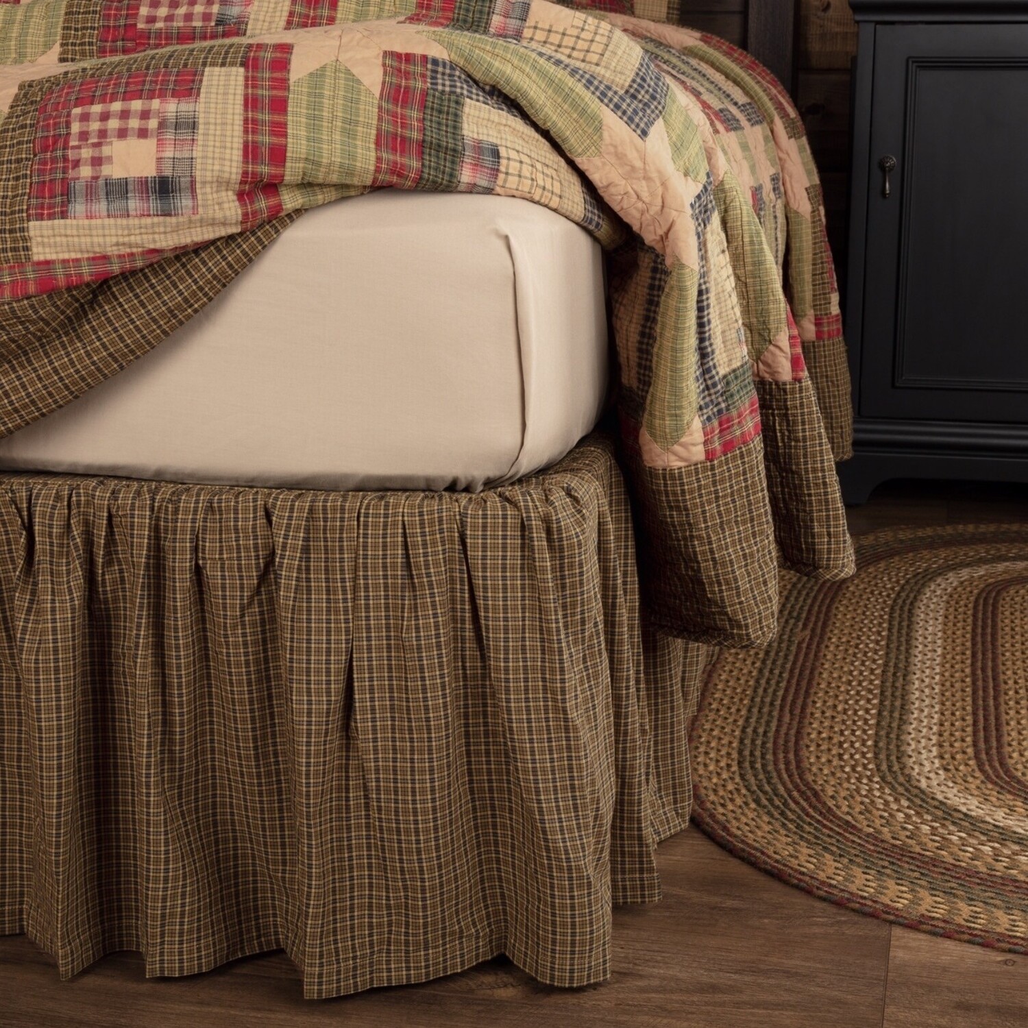 Complete your rustic look with the Tea Cabin Bed Skirt. Available in 3 sizes. This bed skirt features a gathered ruffle with light and dark earth tone moss greens with creme accent plaid. The 16 inch drop provides a graceful finish.
