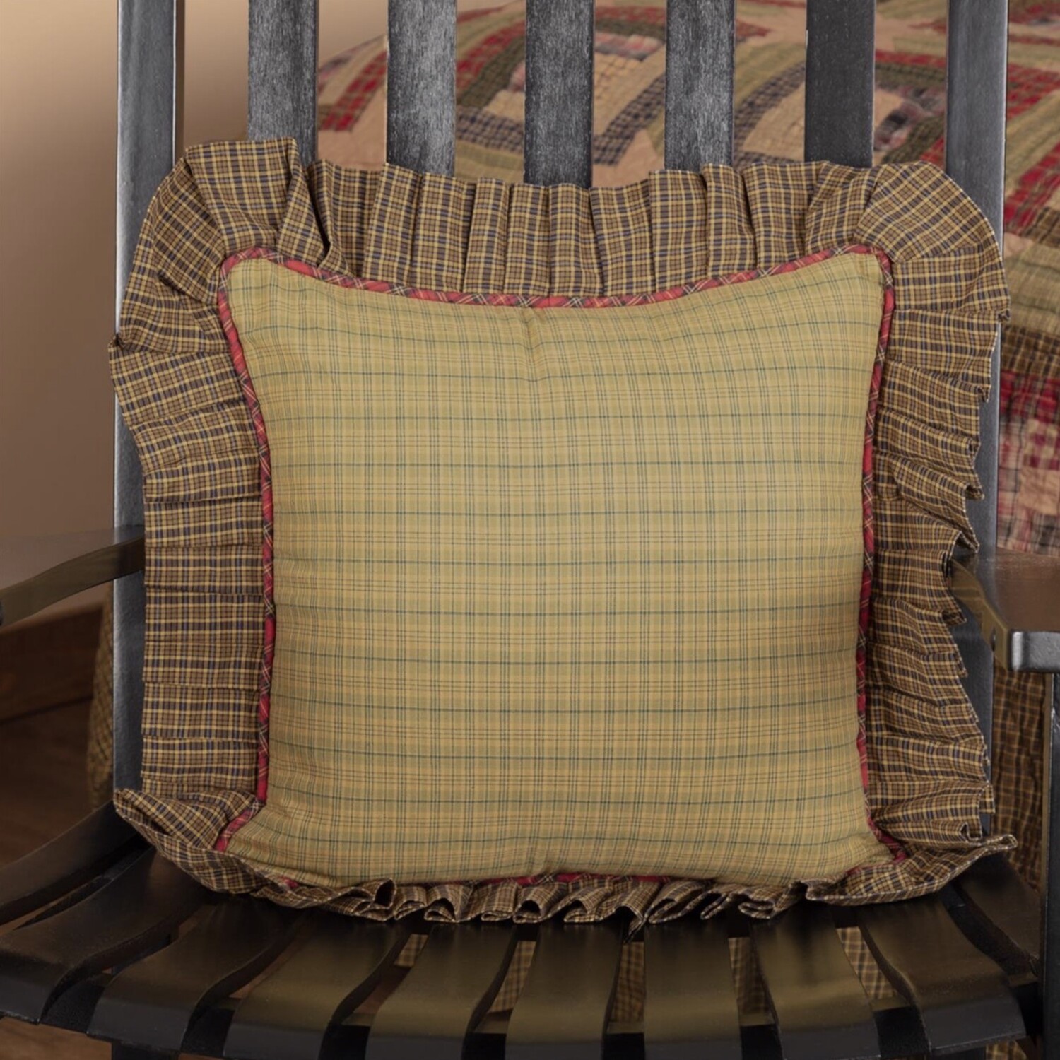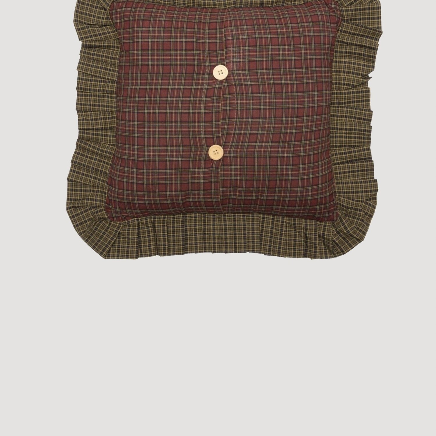 - Front of the sham is multi color green and tan plaid fabric with red piping and contrasting double ruffles