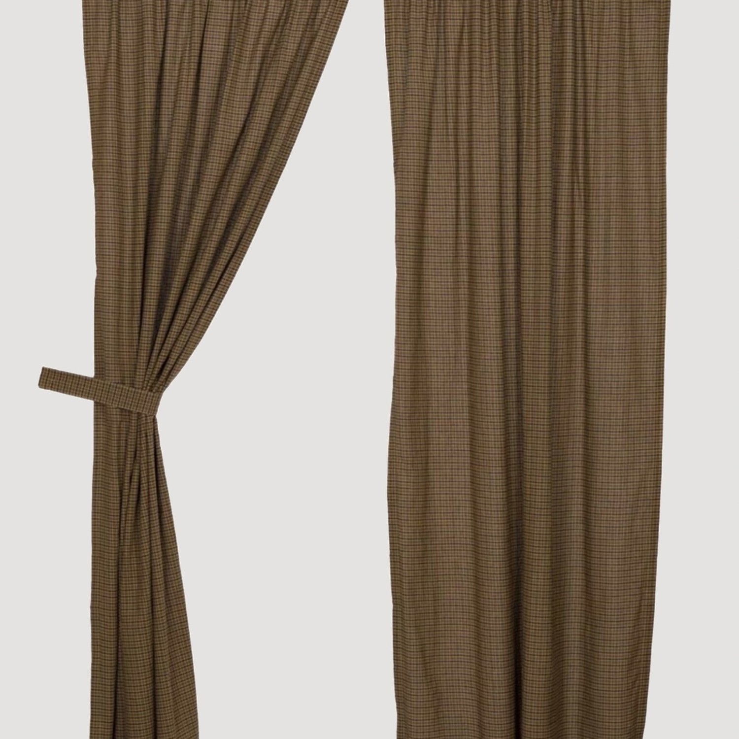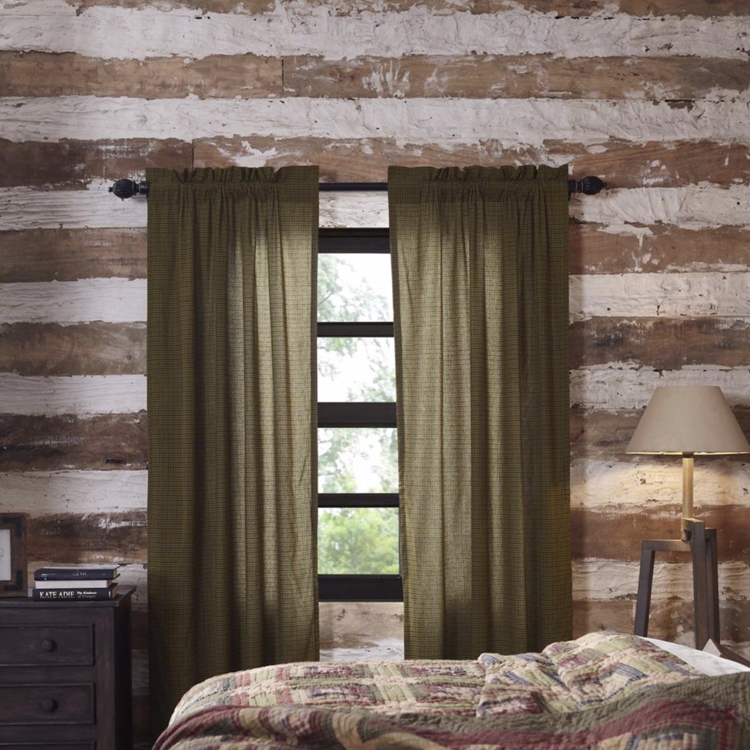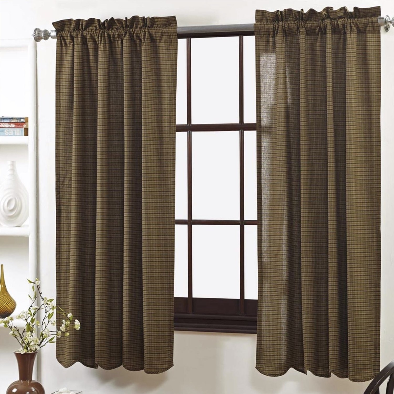 Bring the classic look of the Tea Cabin Green Plaid Short Panel Set to your rustic home. This Panel Set features a plaid in medium & deep olive green tones, highlighted with creme. 100% cotton, lined, with 2 inch header & 2 matching tie backs.