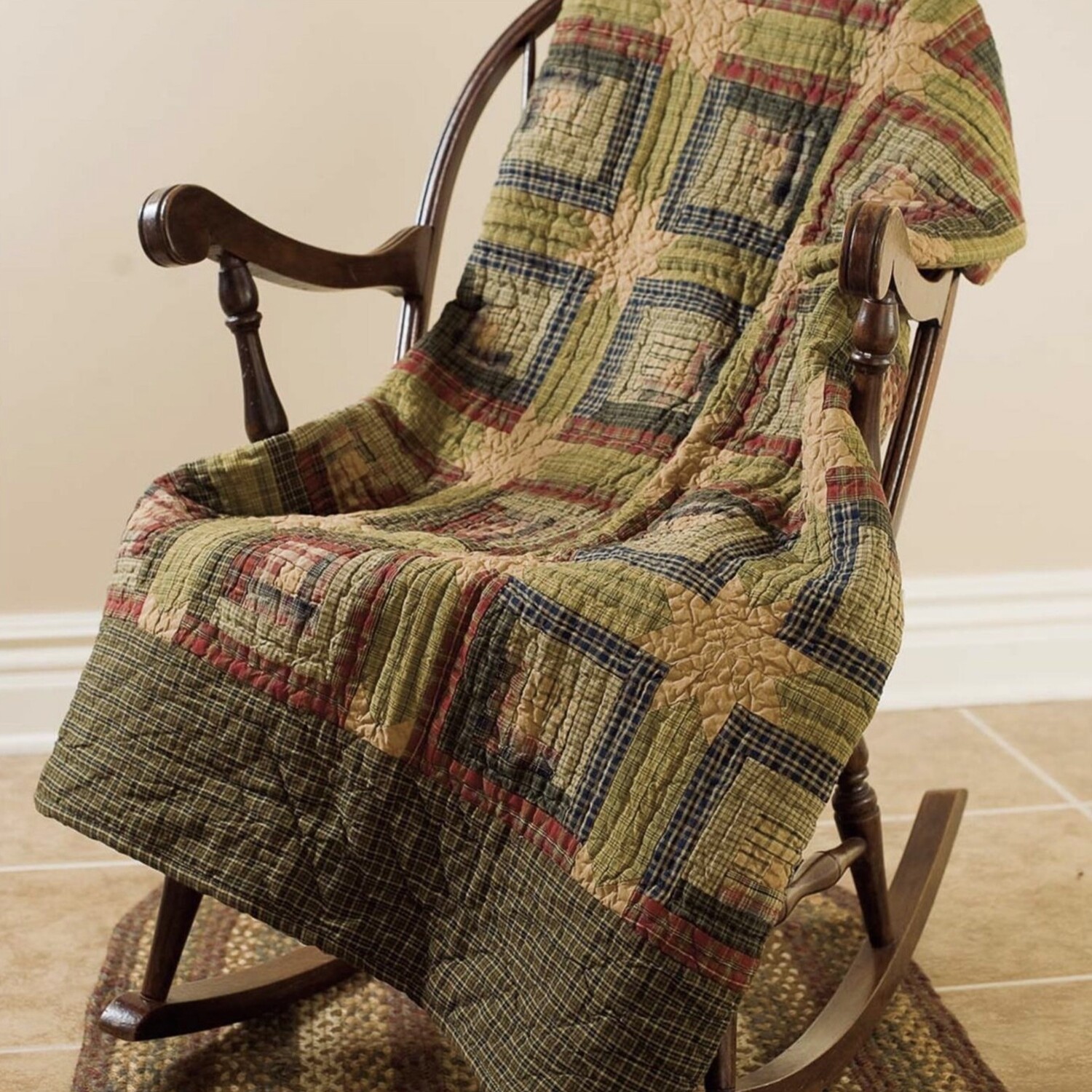 The timeless Tea Cabin Throw is a beautiful touch for your rustic home. Mossy greens, deep red, & warm navy make up the log cabin blocks. Solid tea stain 8 point stars join the log cabin blocks for a rustic design that's sure to be enjoyed for years.