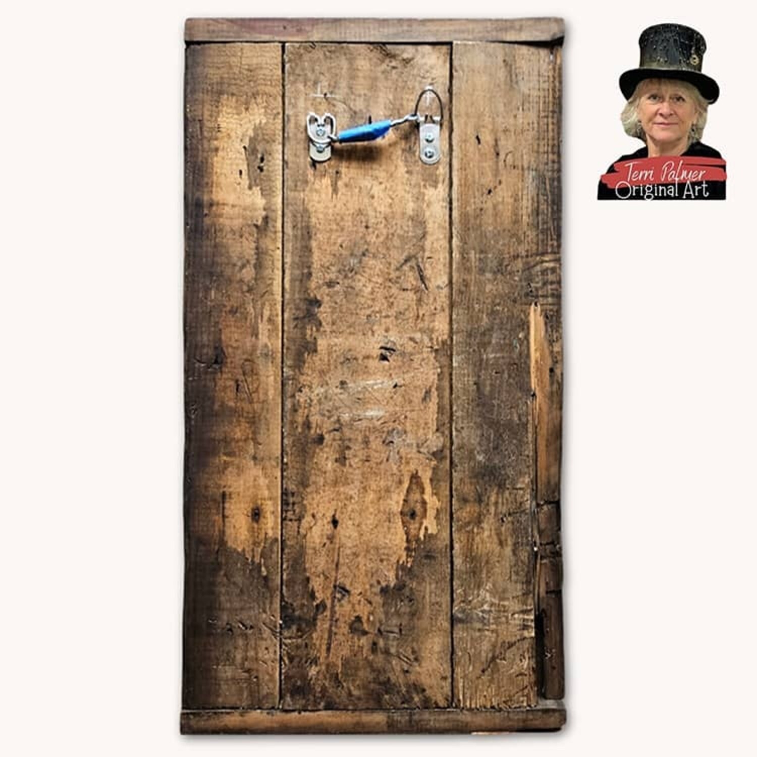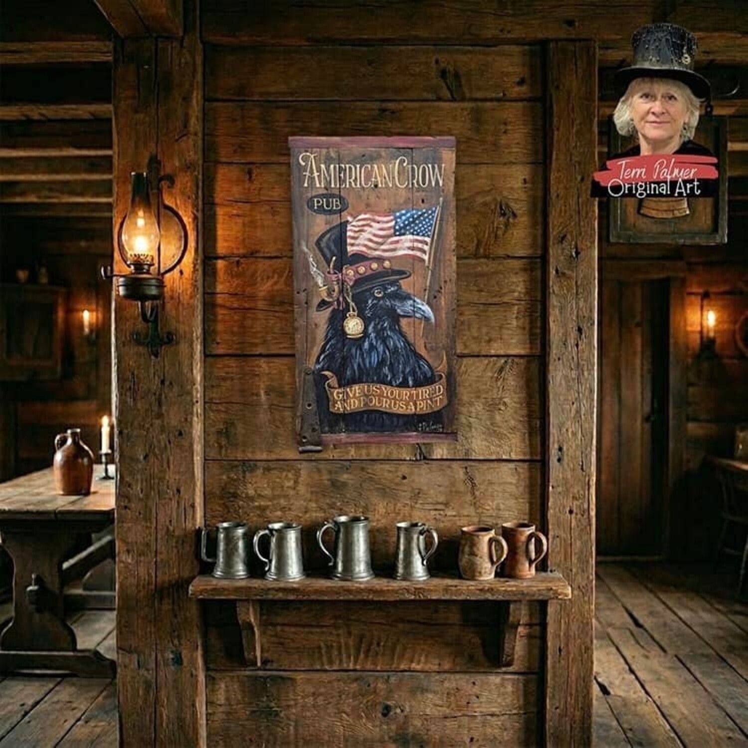 The imagination sees it and the brushes of Terri Palmer bring the vision to life. The American Crow Pub was brought to life on this curated old door with it's rusted hinge. The Crow wears it's steampunk style hat, waving the American flag.