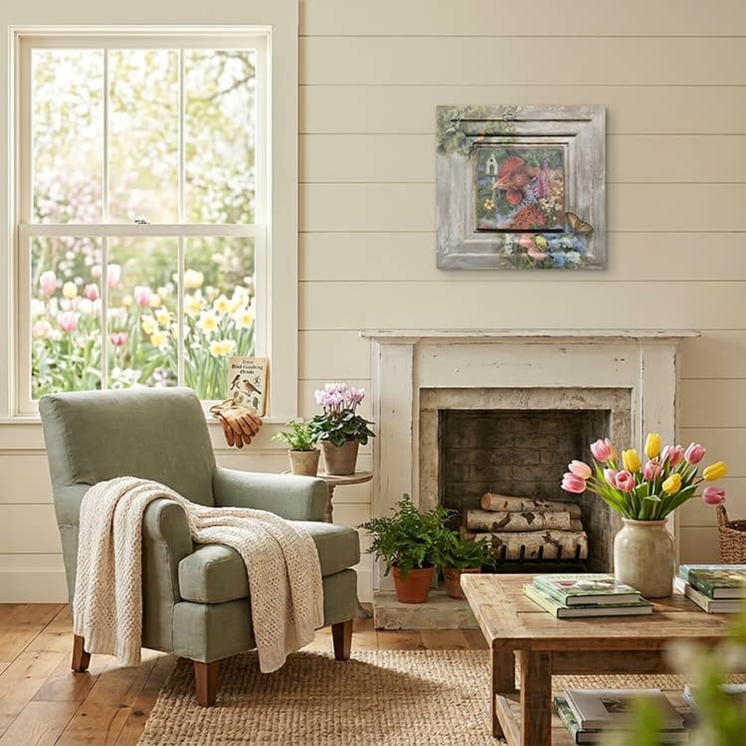 The imagination sees it and the brushes of Terri Palmer bring the vision to life. This beautiful one-of-a-kind piece features a charming hen surrounded by the beauty of nature with flowers, butterflies and birds. Perfect addition to any decor.