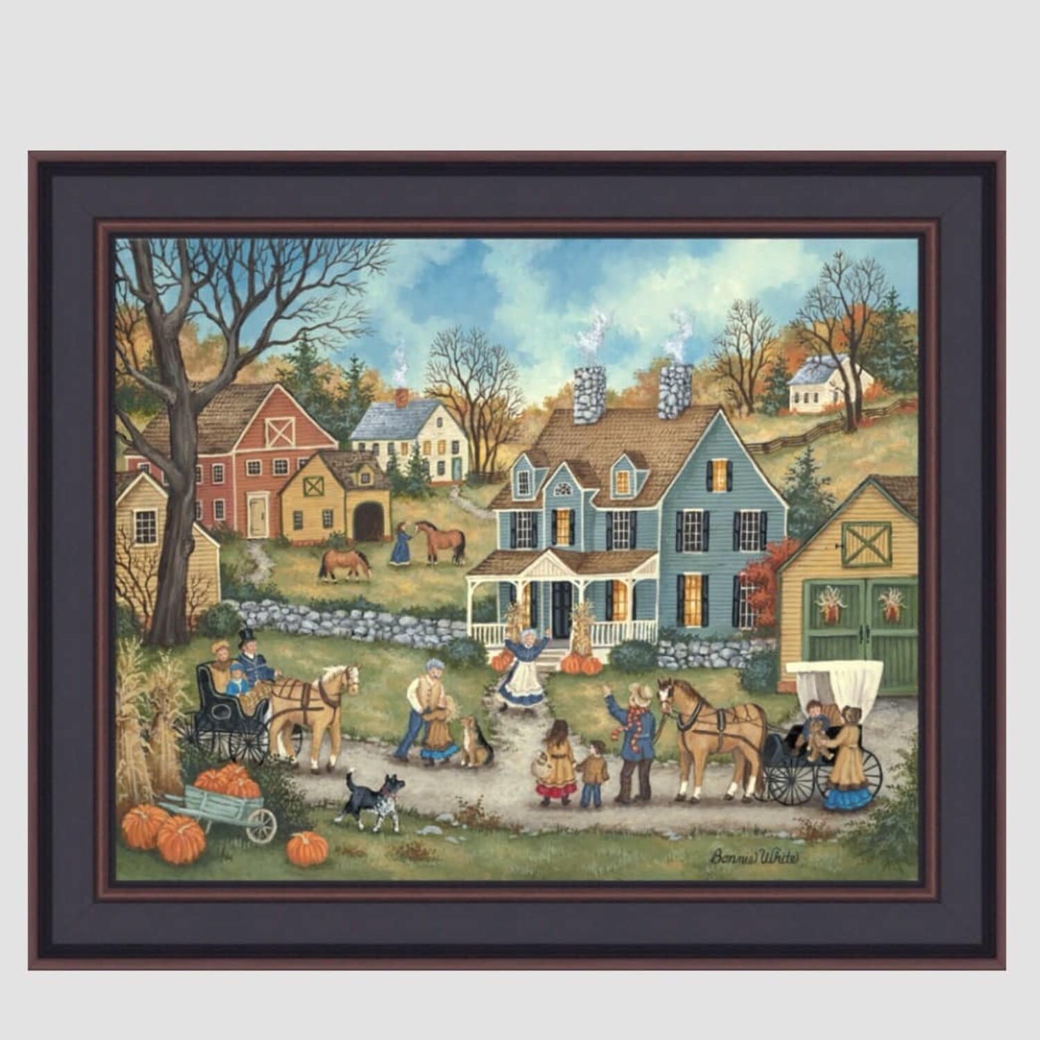 Availability: In Stock$119.99The Safe Harbor Inn is a safe place in this primitive print from artist Bonnie White. It captures the setting sun over the harbor as white caps form and the cold wind causes folks to find a place to shelter for the night. Black and Walnut frame.Picking Pumpkins Print by Bonnie White