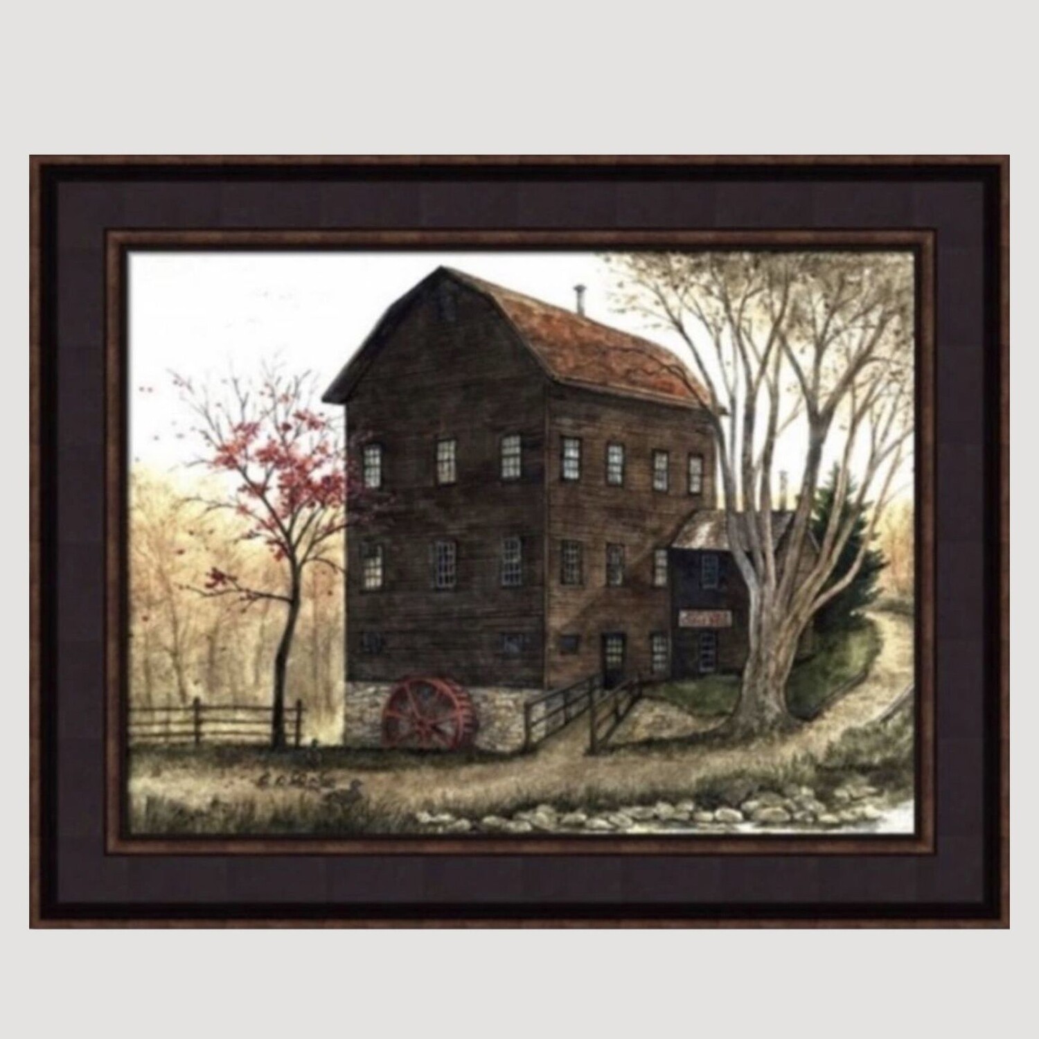 The Mill Framed Art by Bonnie Fisher comes in size 16 x 12. It has a lightly distressed frame, black with stained edges, no glass. This item ships from our supplier in 2 to 3 weeks in the continental United States.