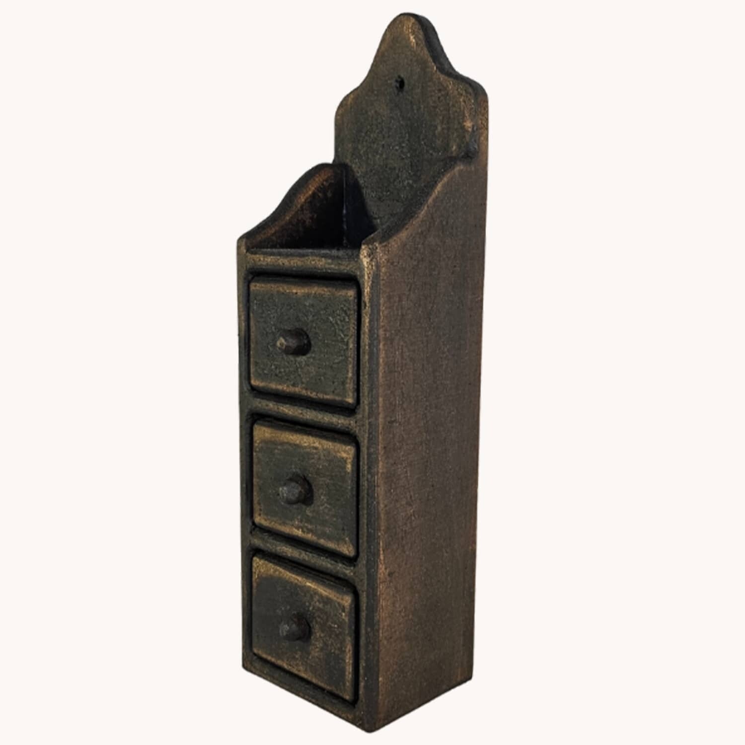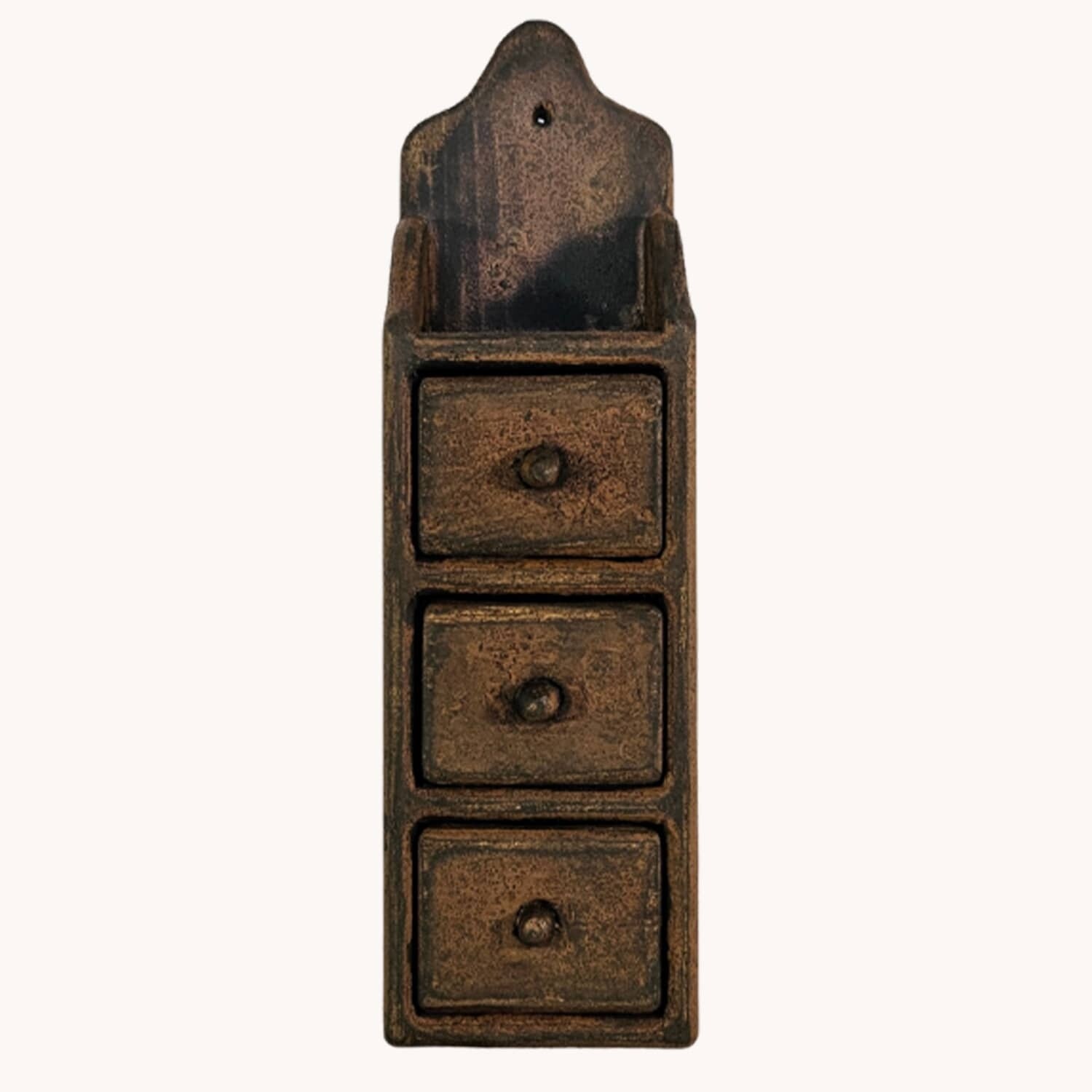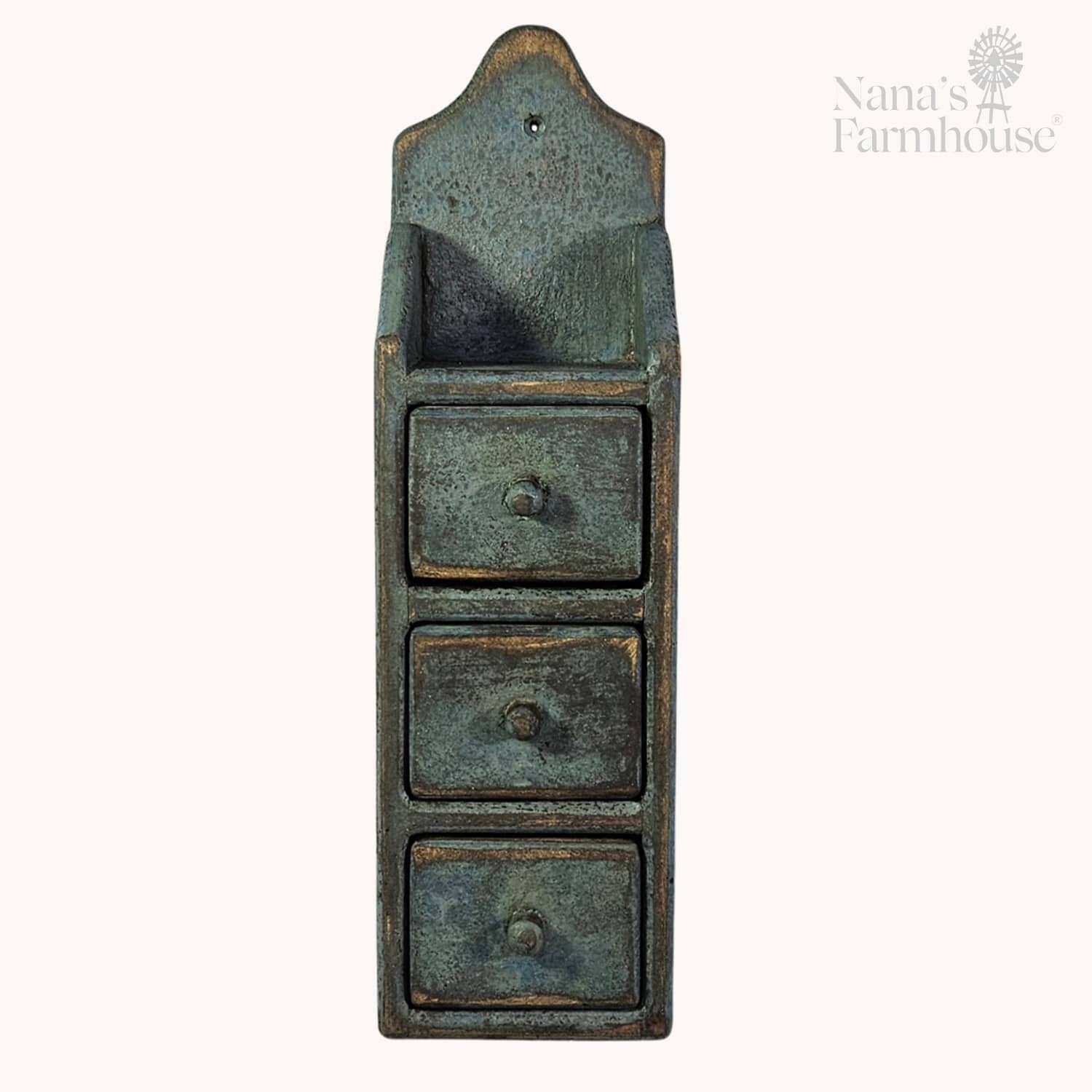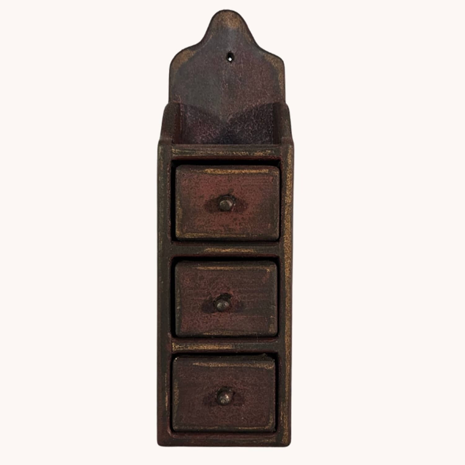 The Three Drawer Wall Box to your Rustic decor. Available in a variety of colors, all with a Primitive distressed finish. Great for a bedroom or bath. Display space on top. Hangs from single hole near top. Handmade in USA of solid wood.