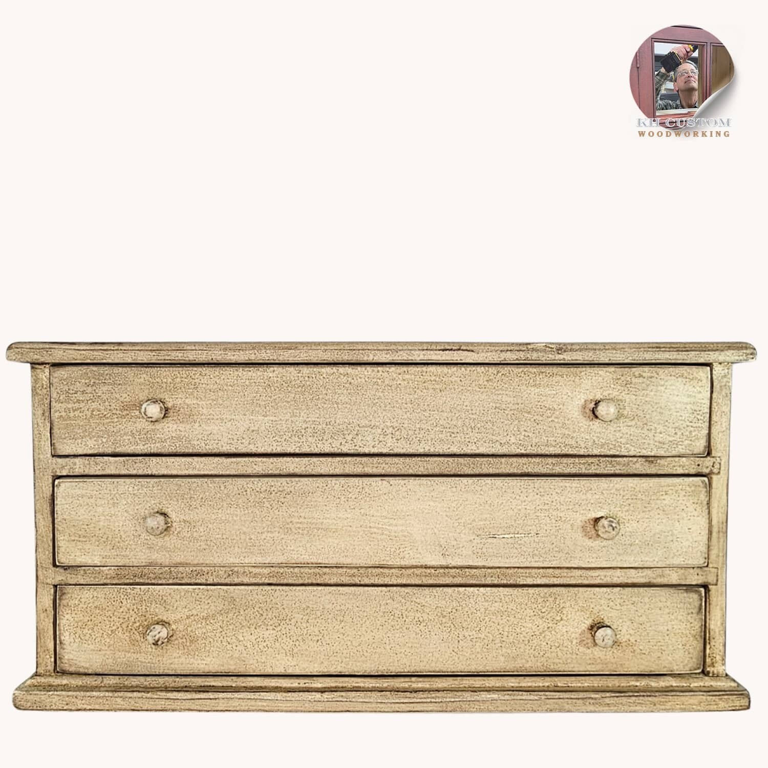 Primitive Three Drawer Box is great for jewelry and other small items. Distressed finish is Cotton White. Made in the USA.