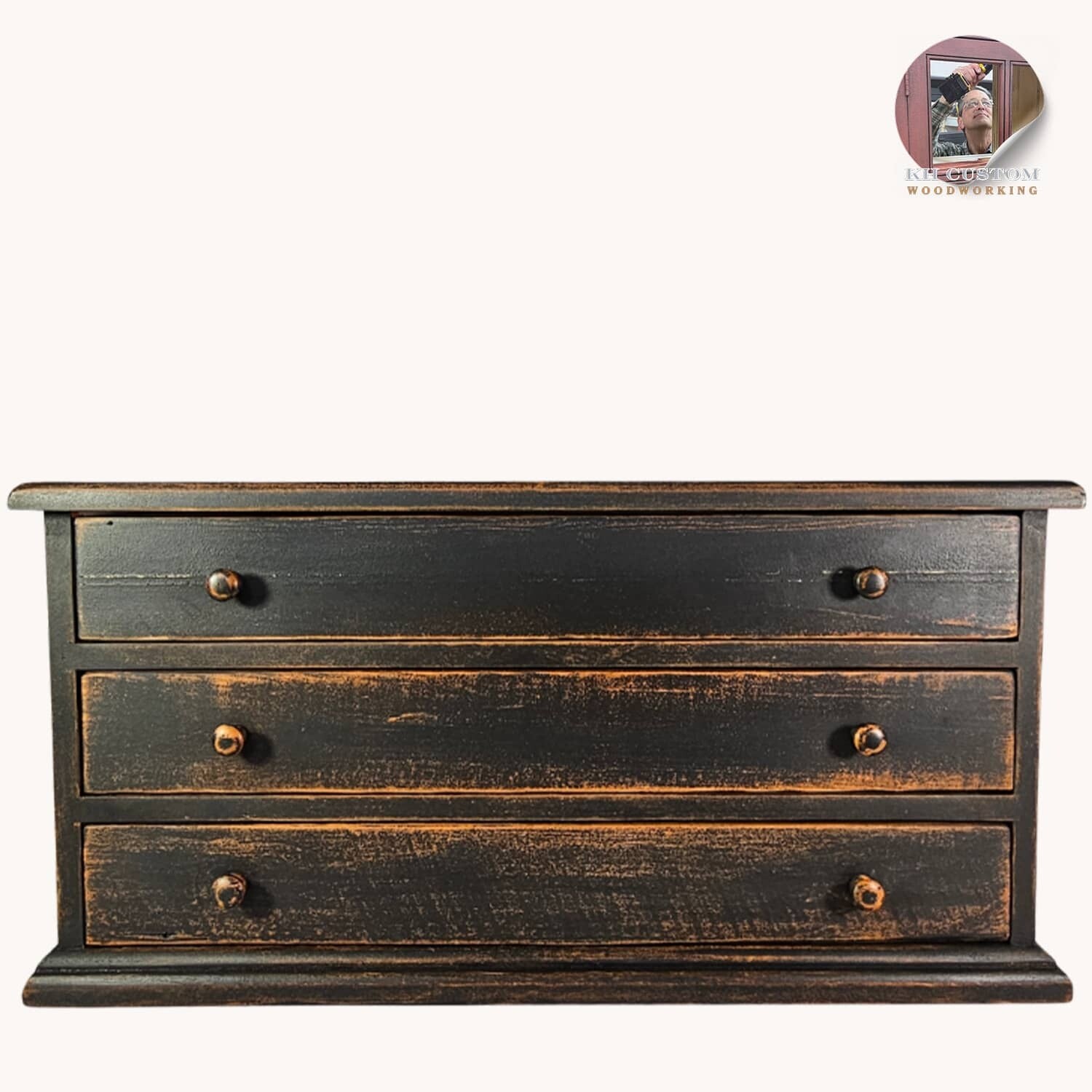 Primitive Three Drawer Treasure Box is great for jewelry and other small items. Distressed finish is Black over Pumpkin. Made in the USA.
