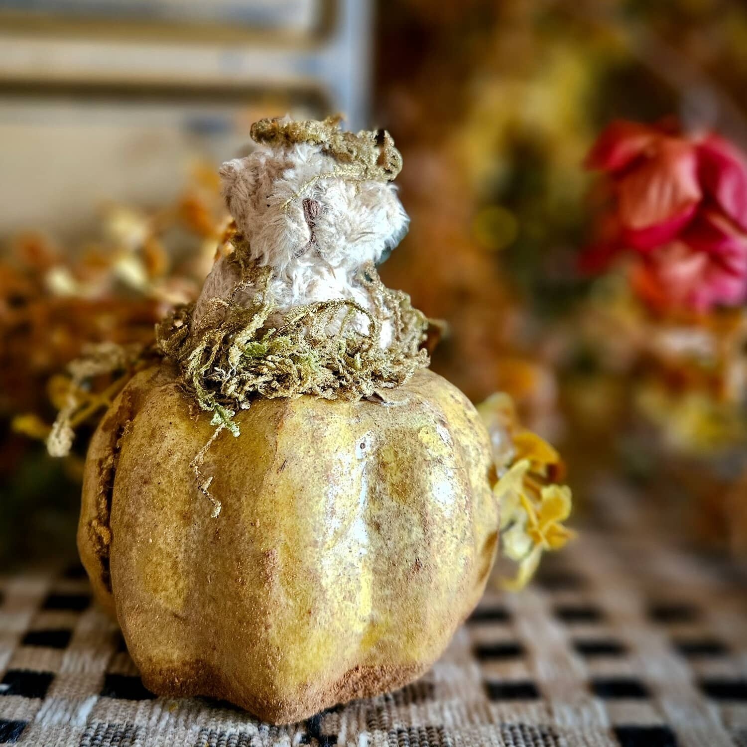 Tiny Bear In Papier-Mache' Pumpkin Mustard - 4x3