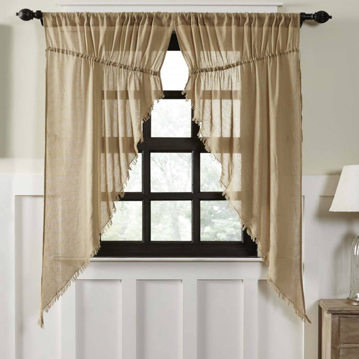 - Tobacco Cloth Prairie Swag FringedAvailability: In Stock$24.95The Tobacco Cloth Prairie Swag Fringed Set brings a luxuriously upscale farmhouse look to your home. A lightweight tobacco cloth drapes your window in sheer elegance with its soft and simple texture. Pick from: Antique White, Natural or Khaki.