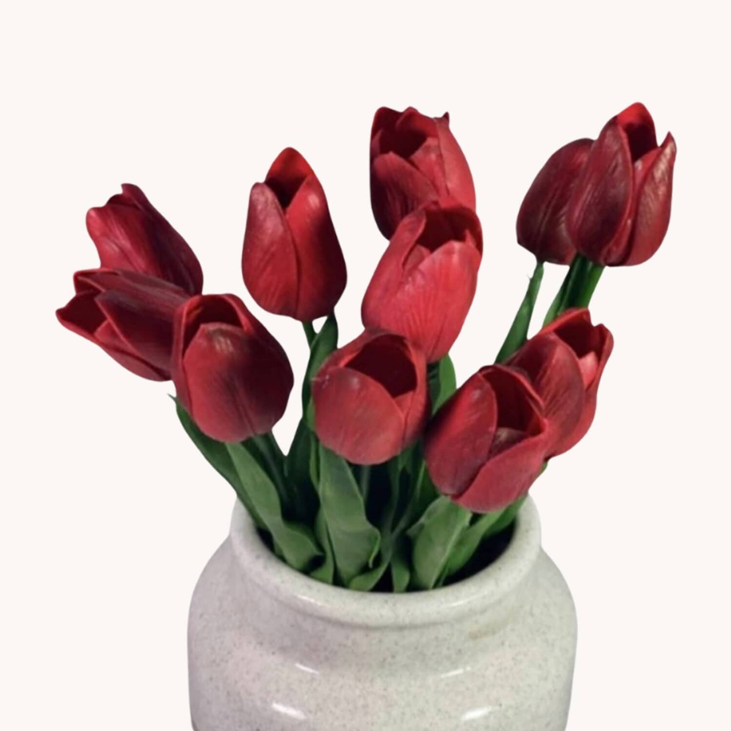 Add the color of the Primitive Red Tulip to your Spring home decor. Real looking greenery! In-stock and ready to ship.