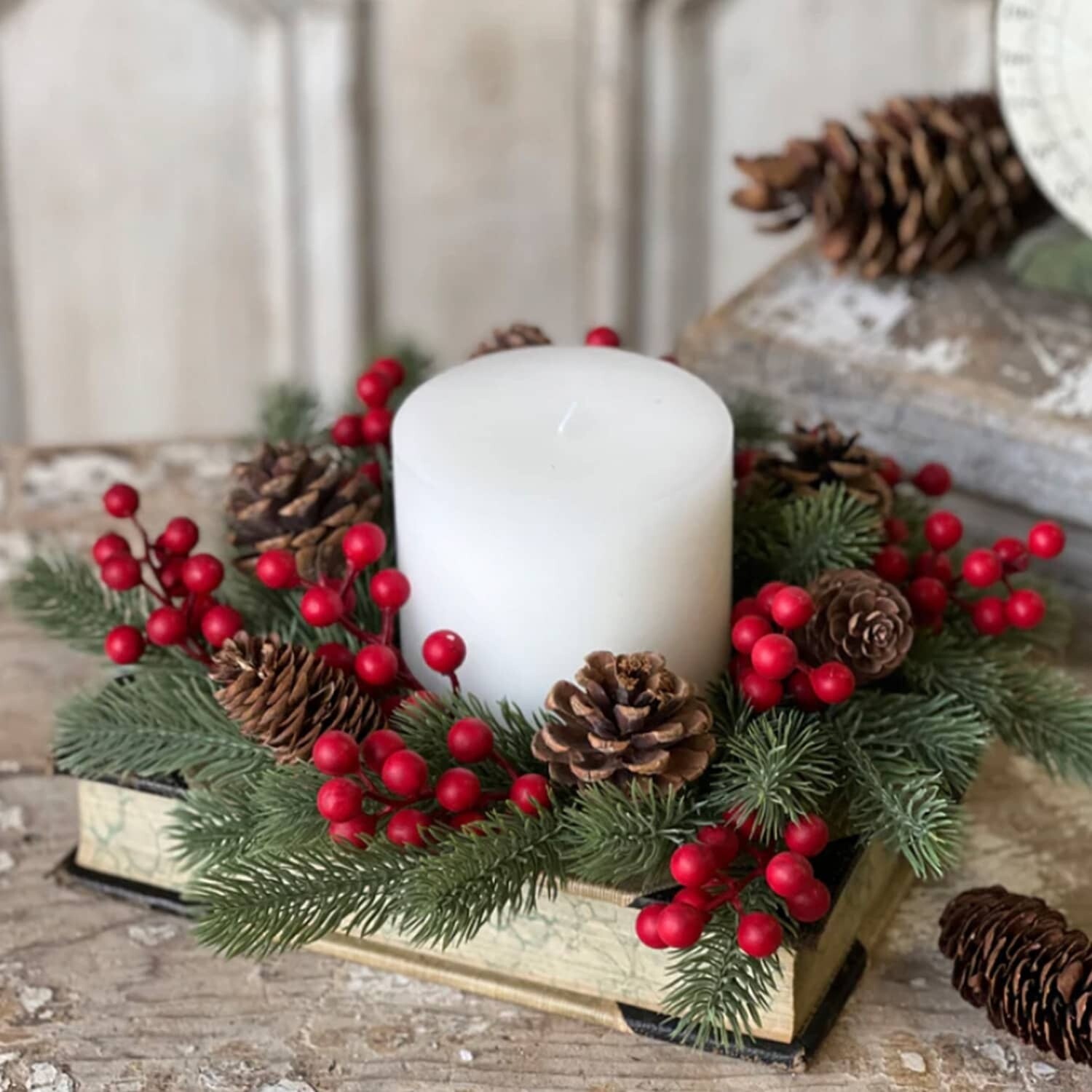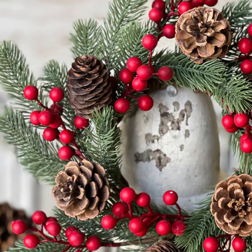 Beautiful greenery is contrasted with pinecones and bright red berries in this classic candle ring. Such a pretty arrangement is created with the vibrant green and red and dusted with a light powdery finish. In stock and ready to ship.