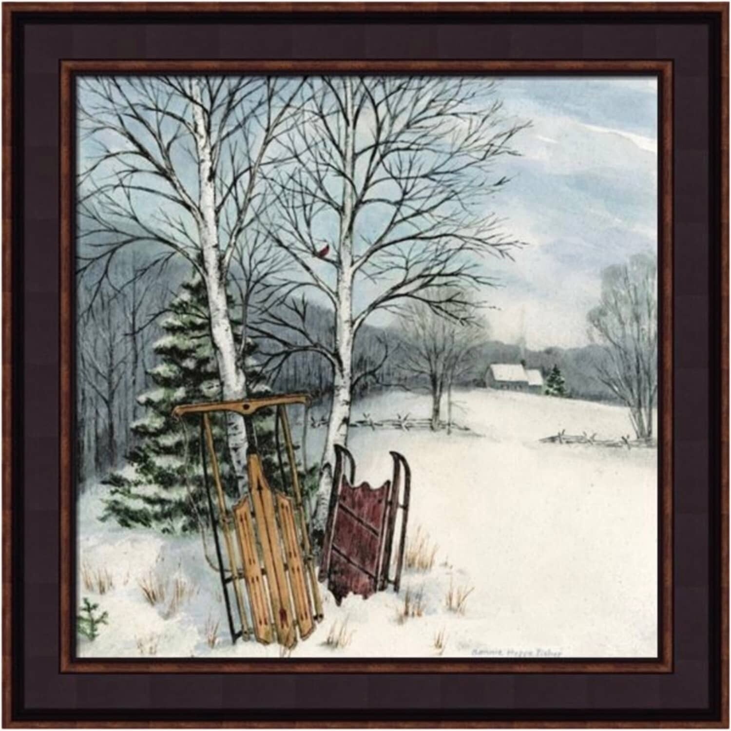 Long Day Sledding comes in size 16 x 16. It has a lightly distressed frame, black with stained edges, no glass. This item ships from our supplier in 2 to 3 weeks in the continental United States.