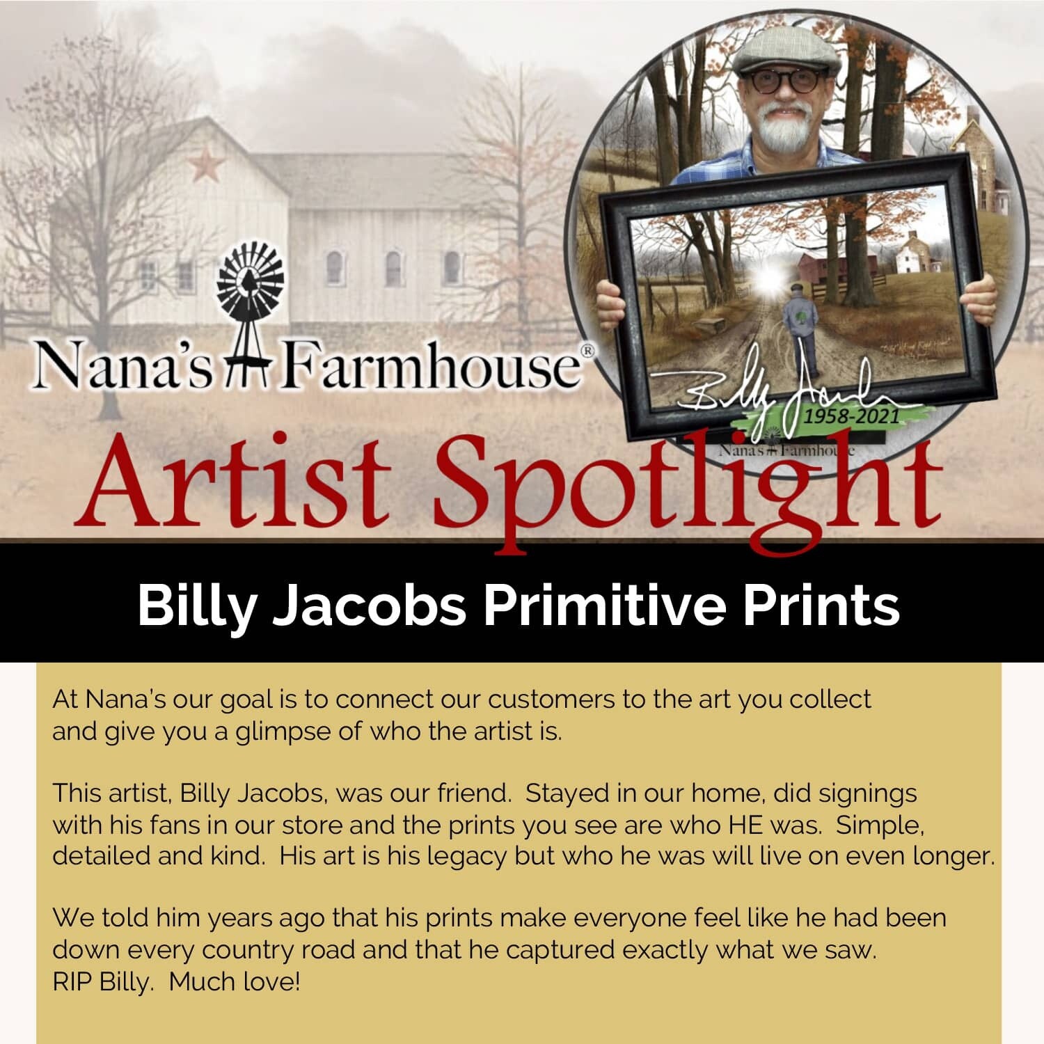 This 1800's farm was captured by Primitive Artist, Billy Jacobs. The blooms are fresh on the trees on a Warm Spring day. The family lives in the old farmhouse and does their work in the large red barn.