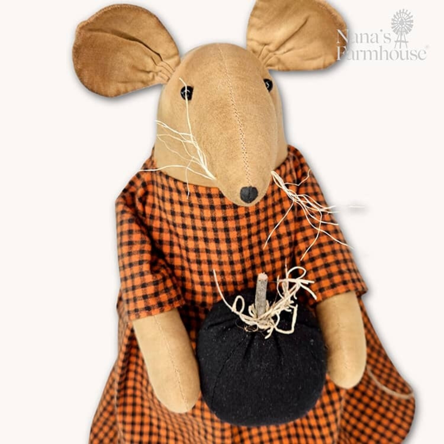 Adorable Mouse doll holding a black pumpkin. She's dressed in a burnt orang checked dress and stands on a weighted base. Handmade in the USA.