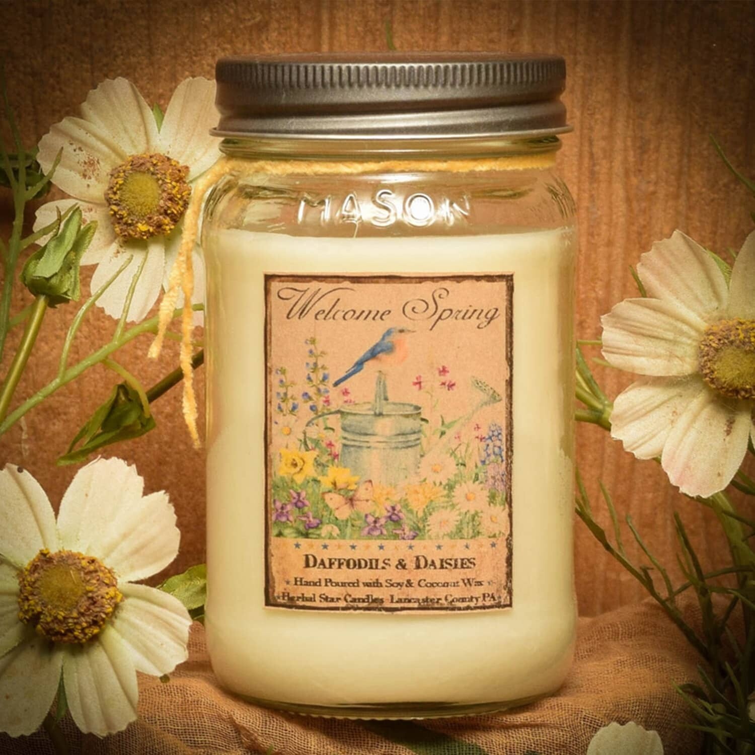 Daffodils and Daisies scent is an abundance of aroma, just like the first day after flowers bloom. Let this delightful scent refresh your space so that you can enjoy "spring" any day! Hand-poured in the USA in 16oz Mason Jar.