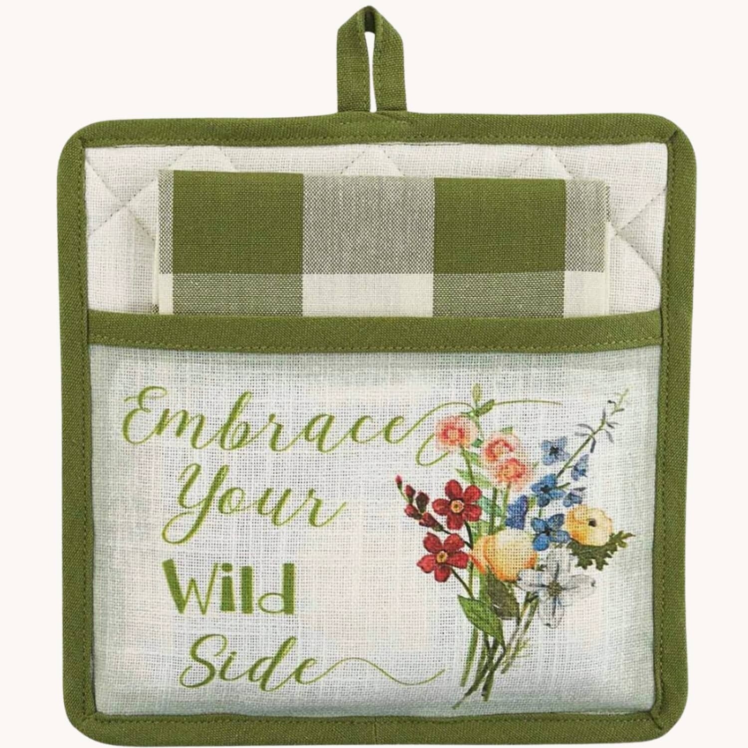 "Embrace Your Wild Side" with this whimsical Wildflower Sketchbook Pocket Potholder Set by Park Designs! The set includes a plaid dishtowel. Made in Candlelight White & Sage!