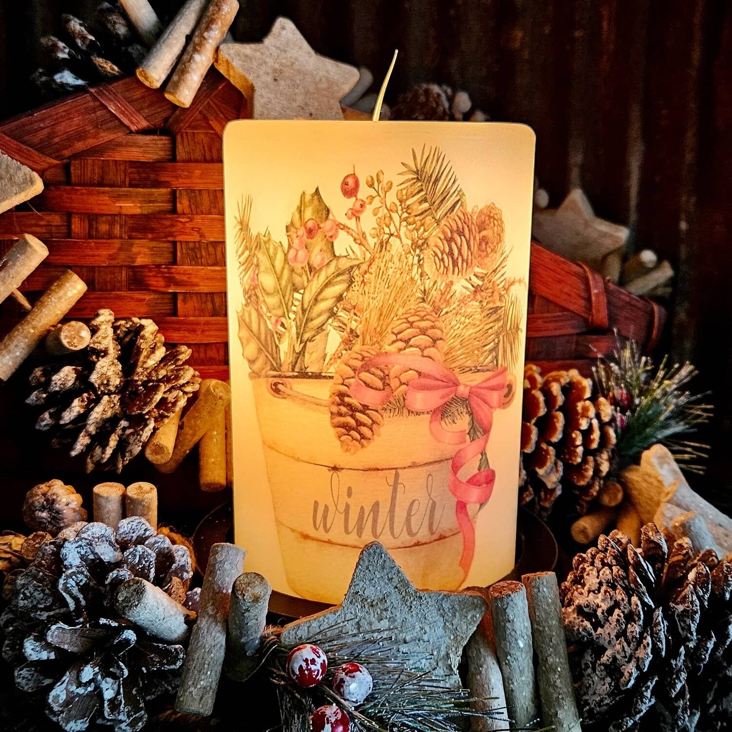 Winter Bucket Greens Candle Sleeve details: