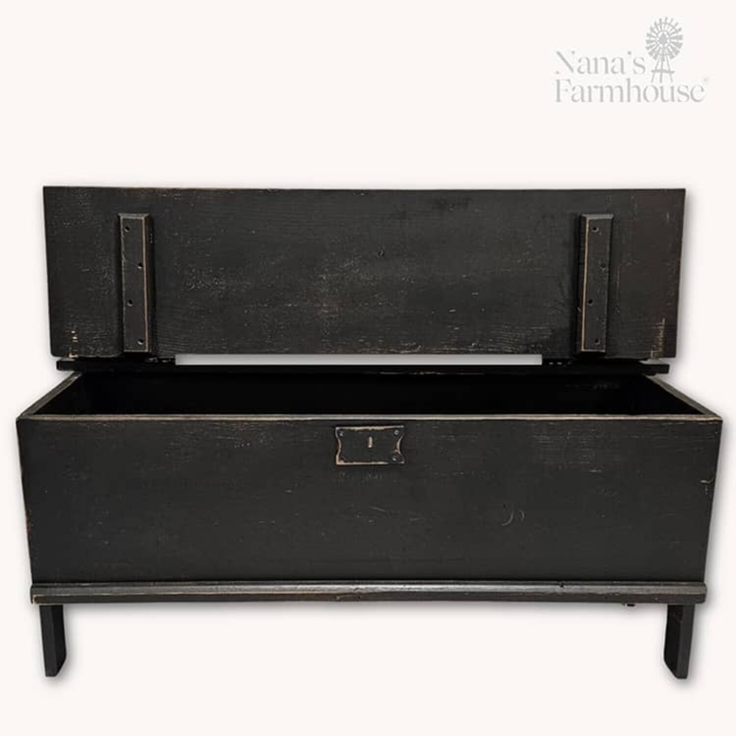 A charming vintage trunk handmade with a distressed black finish and a sturdy hinged lid. This piece adds a timeless yet unique accent to an decor. LOCAL PICKUP ONLY.